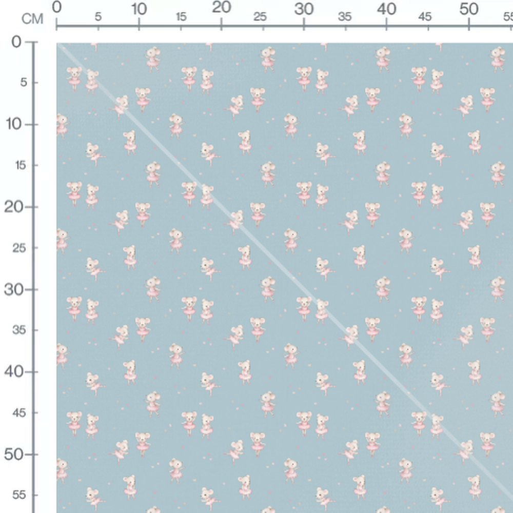 Les souris portent des tutus roses et adoptent des poses de danse classique. Le fond bleu est parsemé de petits cœurs blancs et roses, ajoutant une touche délicate.Les tissus