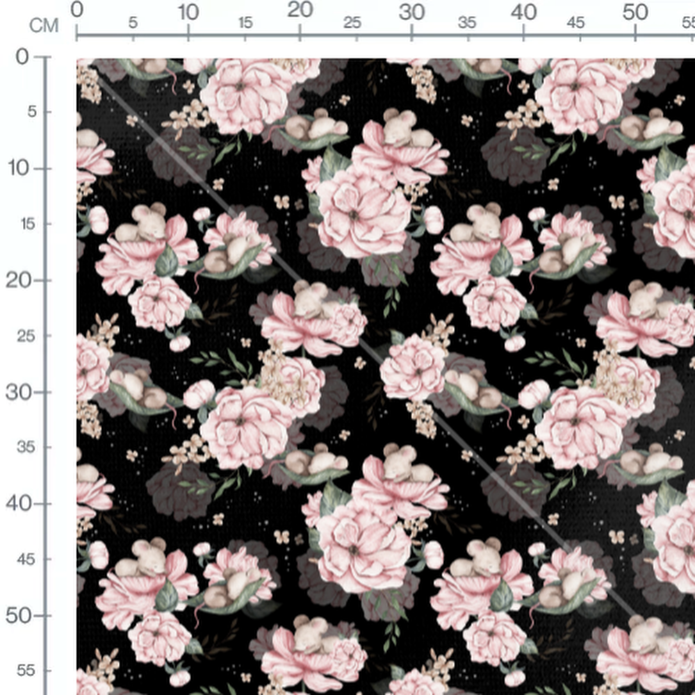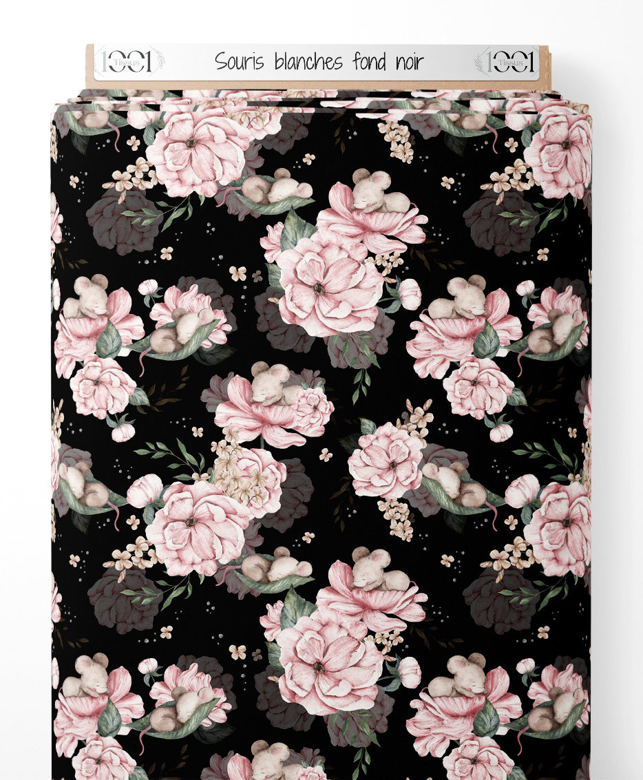 Les souris sont délicatement posées sur de grandes fleurs roses. Des feuilles vertes accompagnent les fleurs, ajoutant une touche de nature. De petites fleurs blanches parsèment le motif, créant un contraste doux avec le fond noir.Les tissus