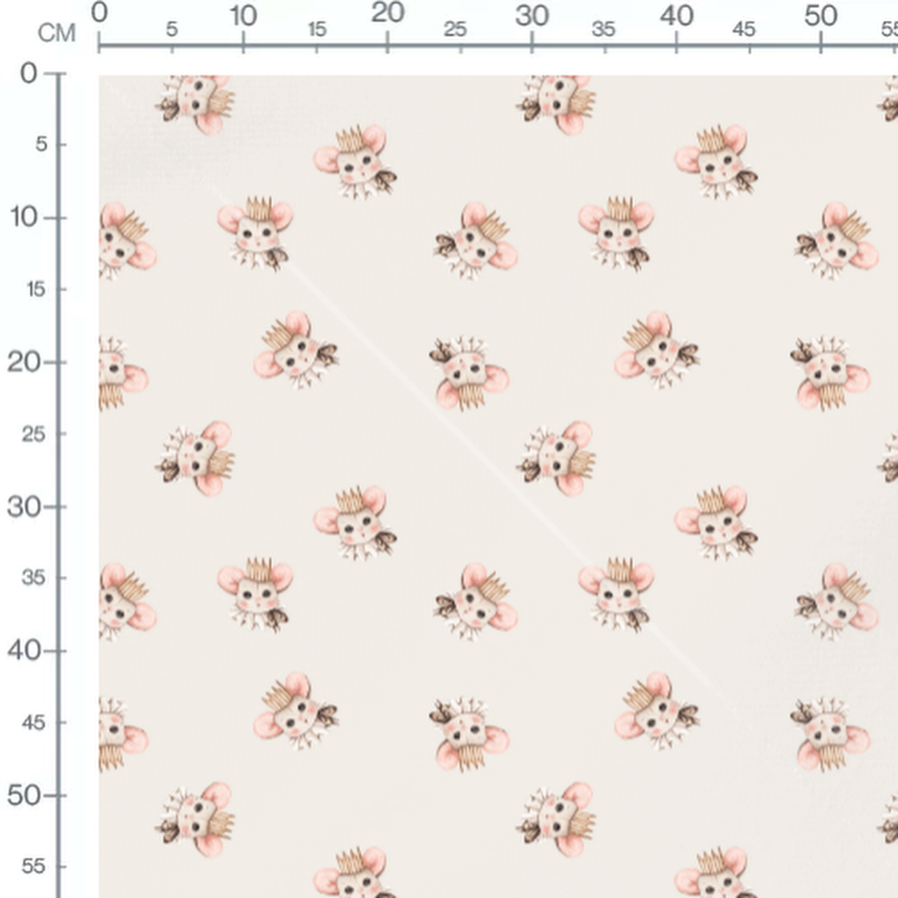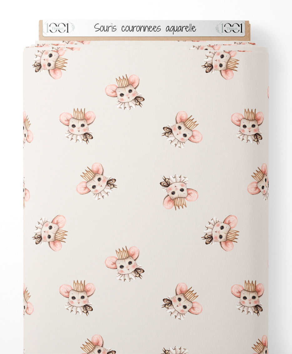 Les souris portent des couronnes dorées et ont des oreilles roses. Elles sont ornées de collerettes blanches et brunes. Le fond est d'une teinte beige douce.Les tissus