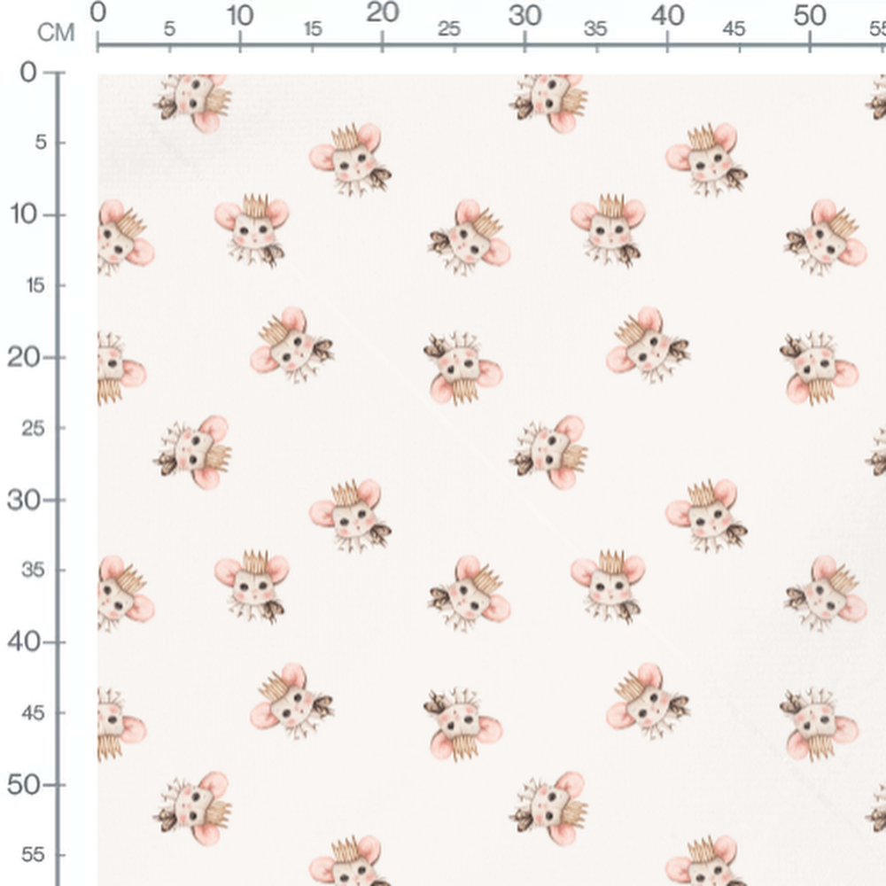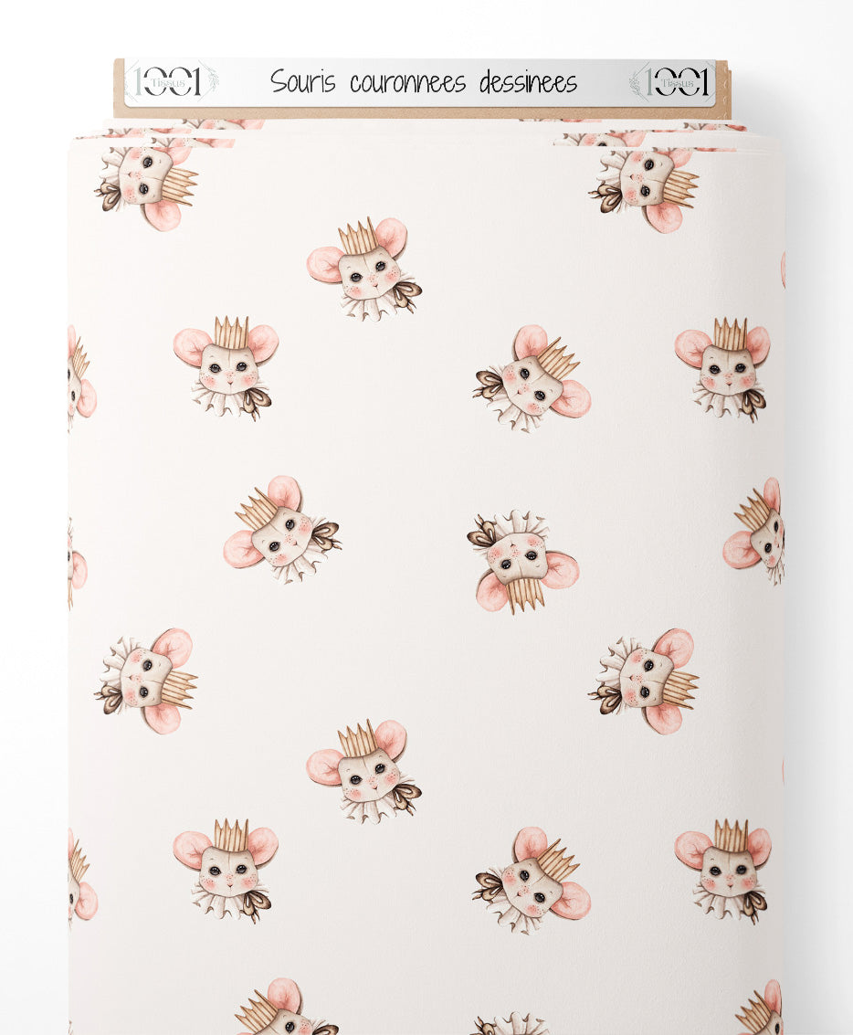 Les souris portent des couronnes dorées et ont des oreilles roses. Le fond est blanc, mettant en valeur les détails délicats des dessins. Chaque souris est ornée de petits nœuds marron.Les tissus