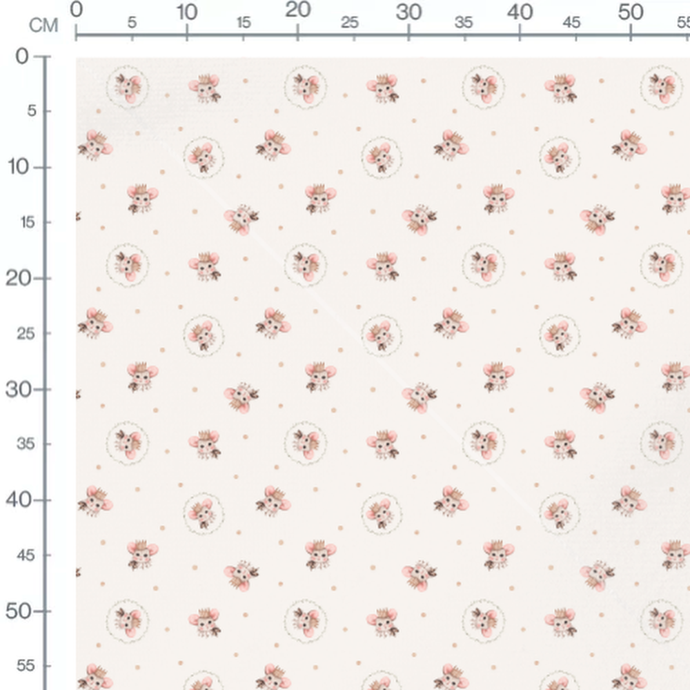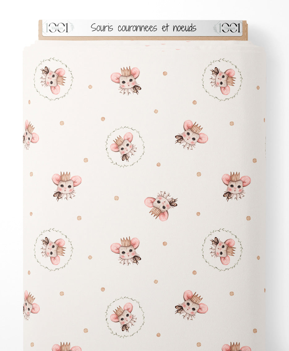 Les souris portent une couronne dorée et un nœud brun. Les pois beige ajoutent une touche de contraste sur le fond blanc.Les tissus