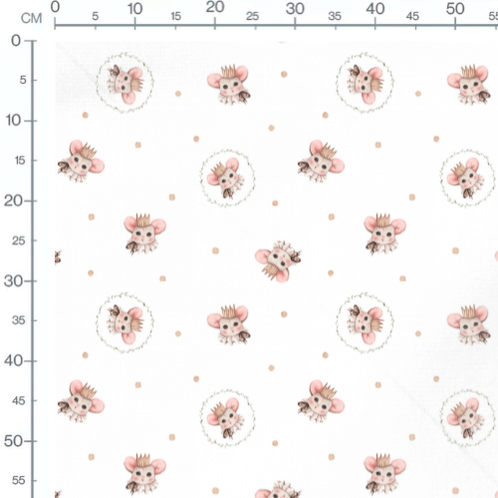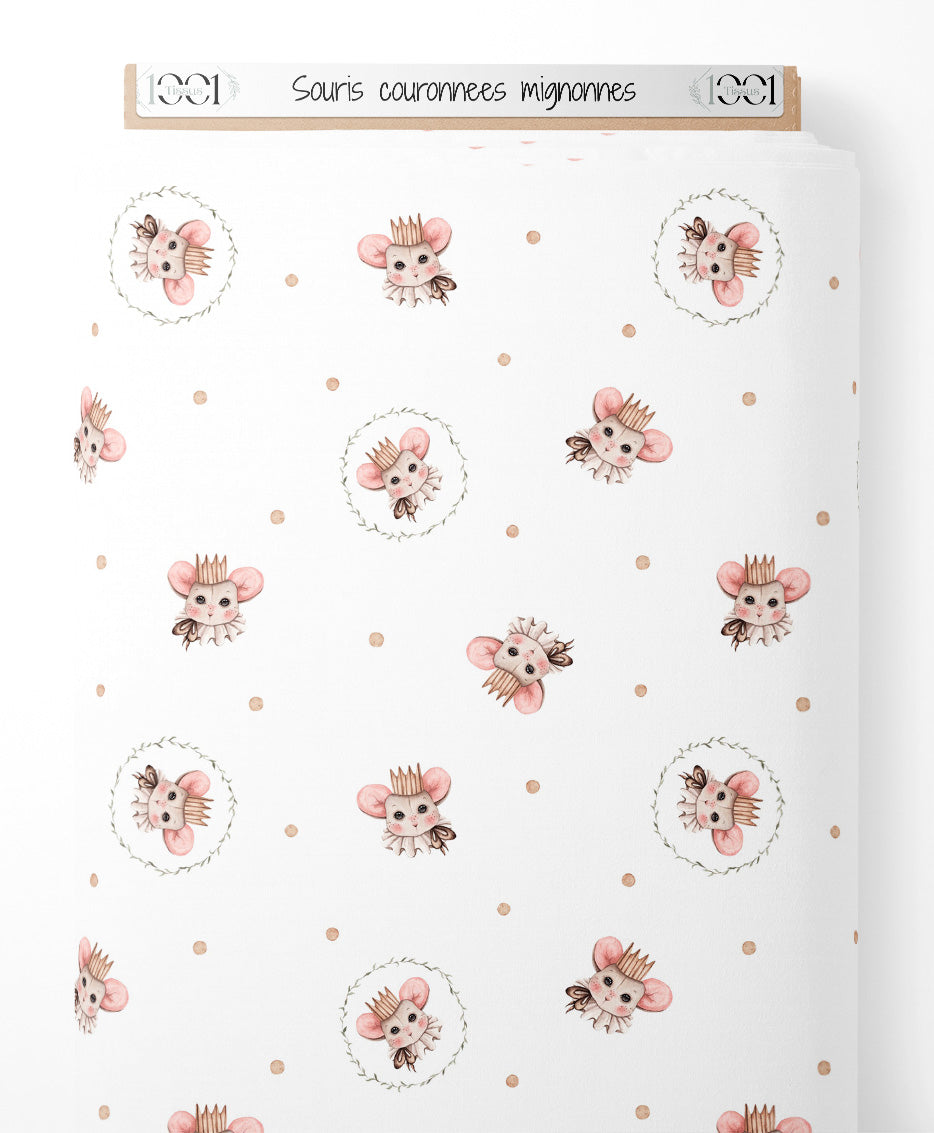 Les souris portent des couronnes dorées et des collerettes blanches. Les petits pois beige ajoutent une touche délicate au fond blanc.Les tissus