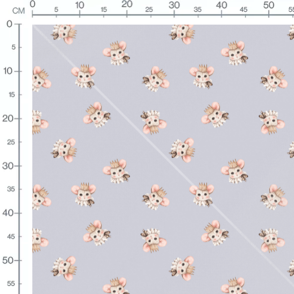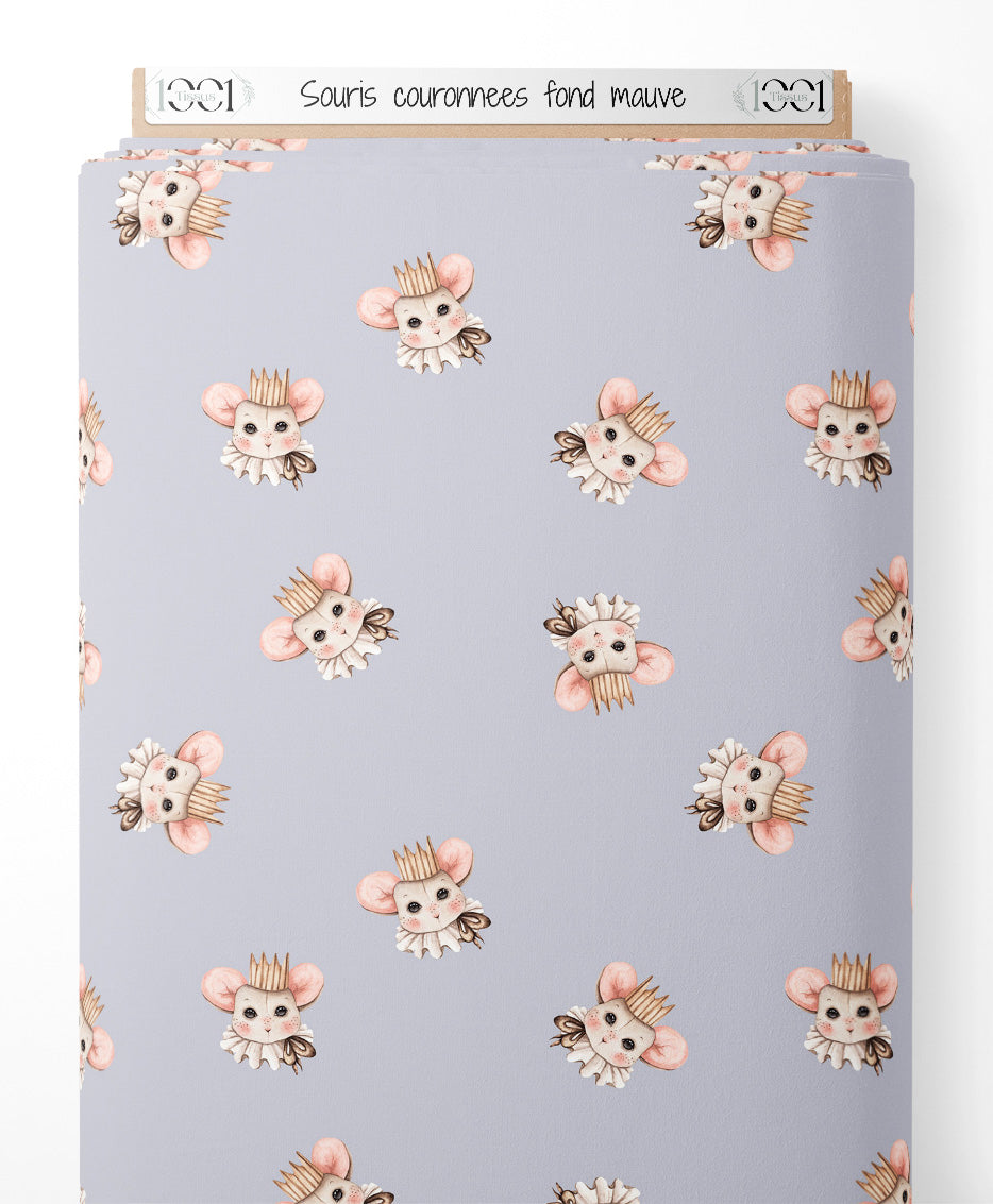 Les souris portent des couronnes dorées et des collerettes blanches. Leurs oreilles sont d'un rose délicat. Le fond est d'une teinte mauve douce.Les tissus