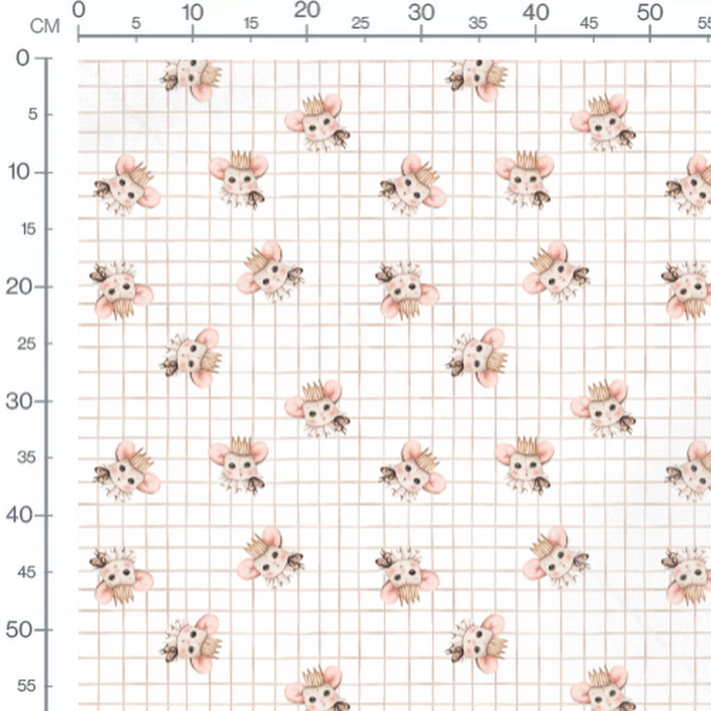 Les souris portent des couronnes dorées et ont de grandes oreilles roses. Chaque souris est ornée d'un petit nœud noir. Le fond présente un motif de quadrillage beige.Les tissus