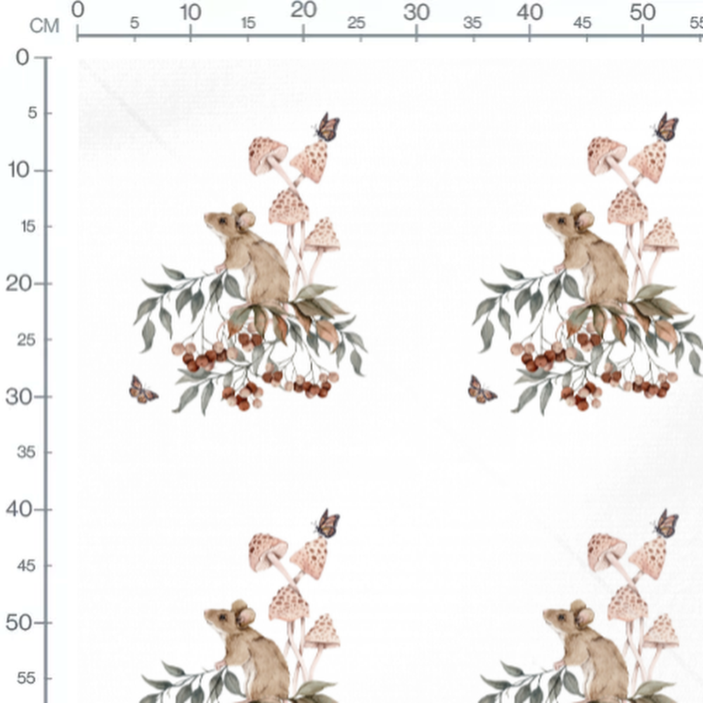 Les champignons sont de couleur beige avec des motifs bruns. Les feuilles sont vertes et les baies sont rouges. Deux papillons aux ailes colorées entourent la scène.Les tissus