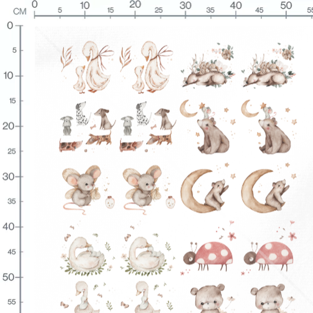 Souris, lapins et ours avec des lunes dorées. Cygnes blancs et champignons rouges à pois blancs. Étoiles blanches dispersées autour des animaux.Les tissus