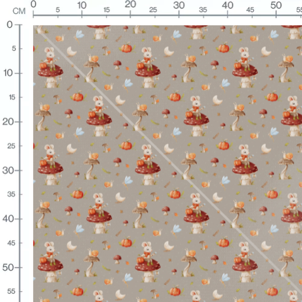 Les souris portent des vêtements et sont assises sur de grands champignons rouges. Les escargots ont des coquilles orange et se trouvent sur des champignons bruns. Des citrouilles orange et des libellules bleues ajoutent une touche de couleur. Des feuilles d'automne en différentes teintes parsèment le fond beige.Les tissus