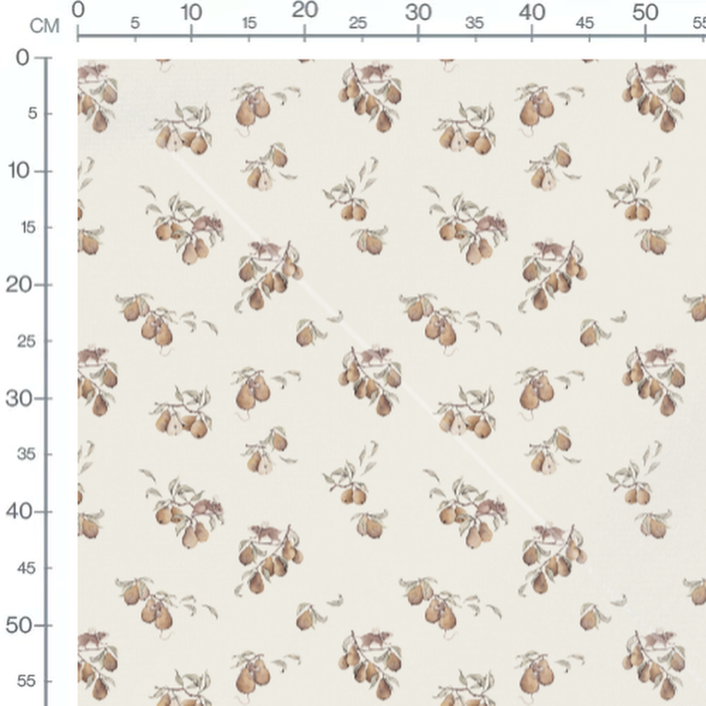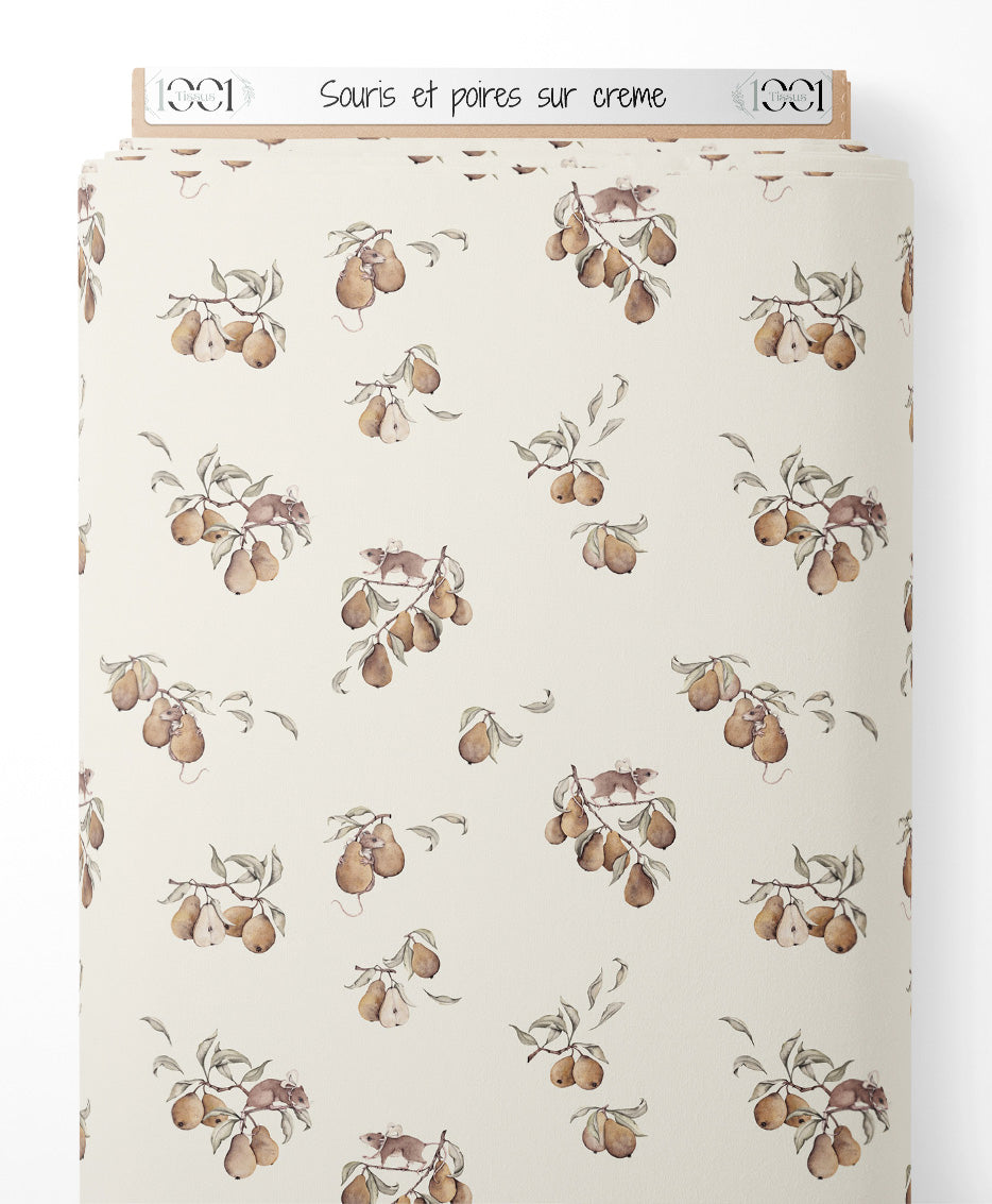 Les souris sont délicatement dessinées avec des détails fins. Les poires sont représentées en grappes avec des nuances de marron. Les feuilles ajoutent une touche de vert subtil au motif.Les tissus