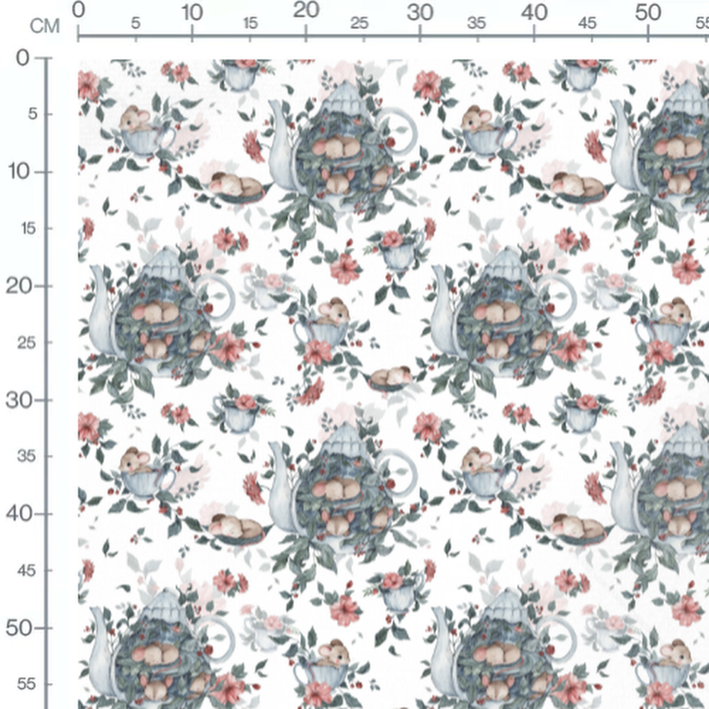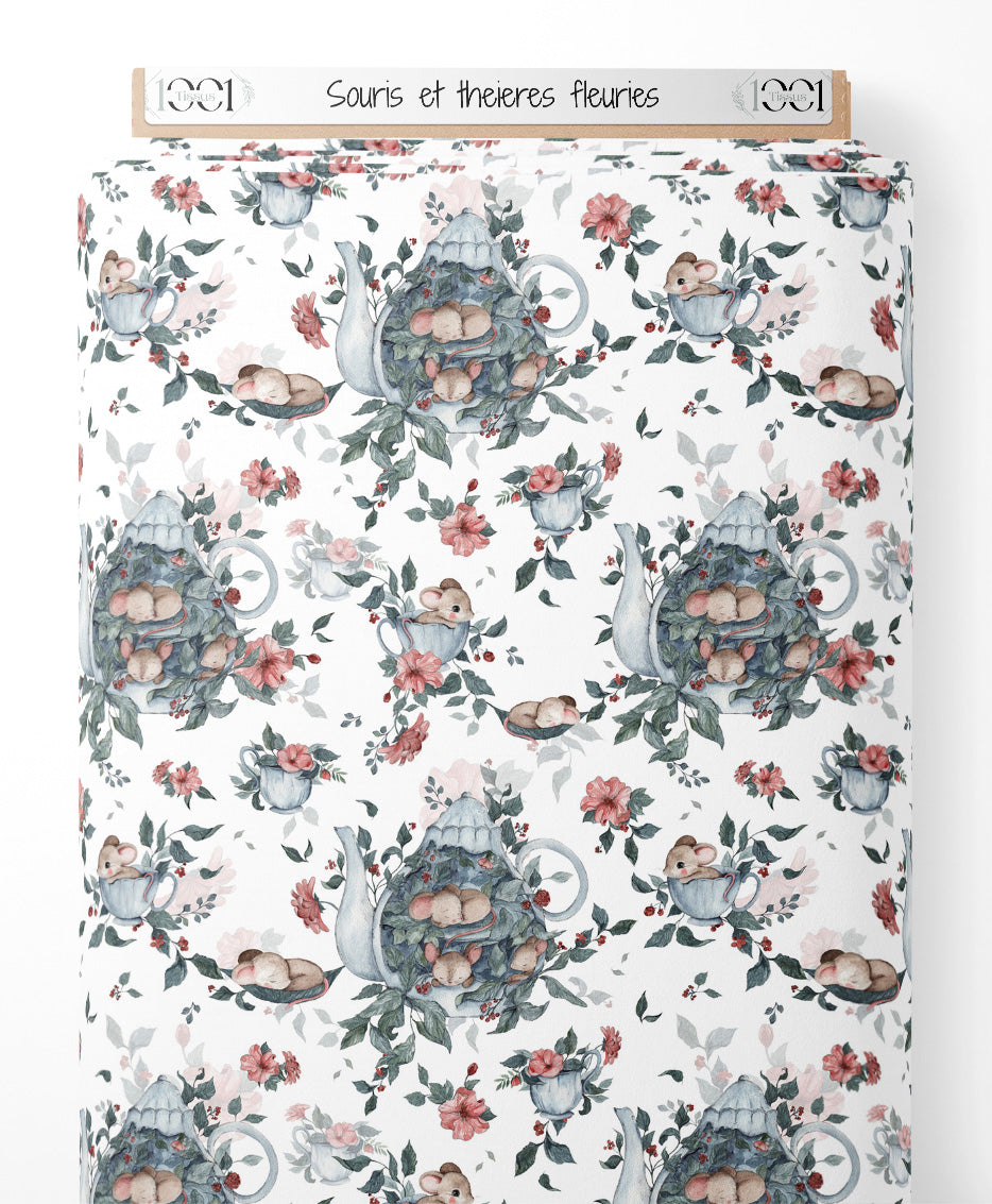 Les souris sont nichées dans des théières décorées de fleurs. Les fleurs roses et les feuilles vertes ajoutent une touche délicate au motif. Les détails des théières et des souris sont finement dessinés.Les tissus