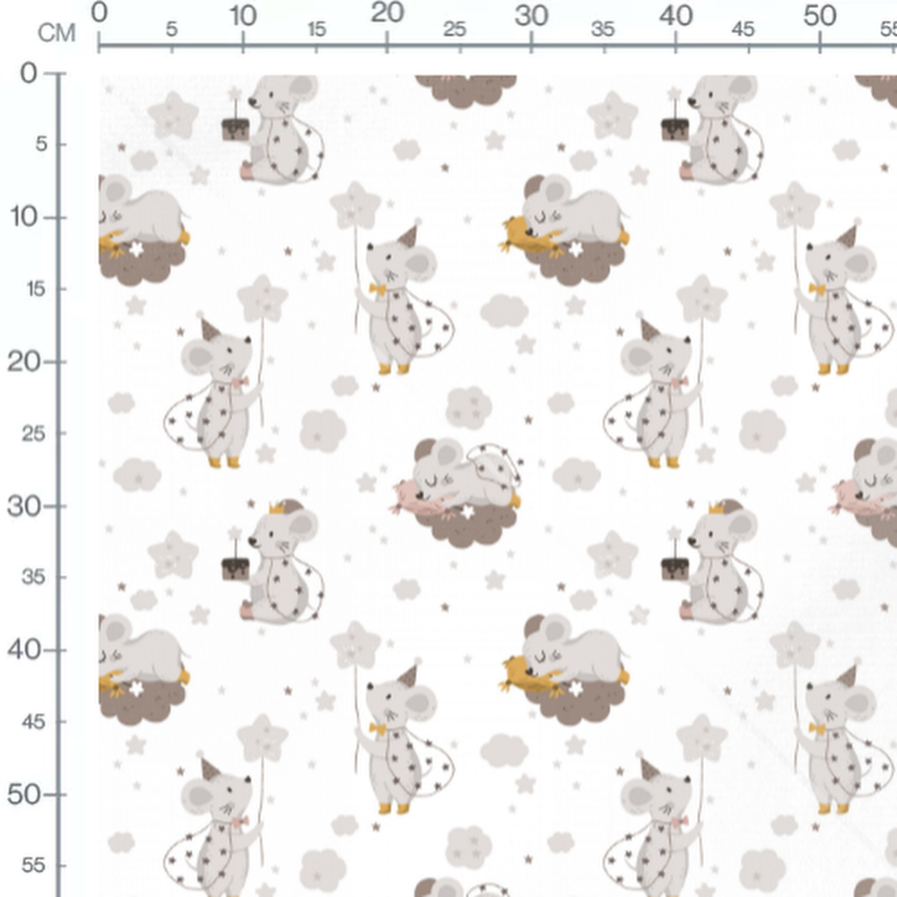 Les souris portent des chapeaux pointus et tiennent des ballons en forme d'étoile. Certaines souris dorment sur des nuages marron et beige.Les tissus