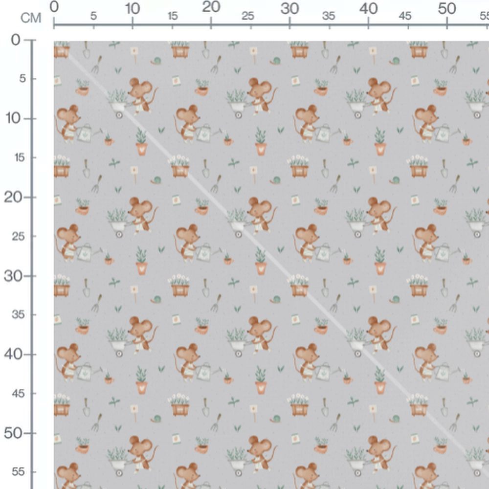 Les souris portent des vêtements rayés et arrosent des plantes. Des outils de jardinage comme une pelle et un arrosoir sont dispersés. Des pots de fleurs et des panneaux de jardinage complètent le motif.Les tissus