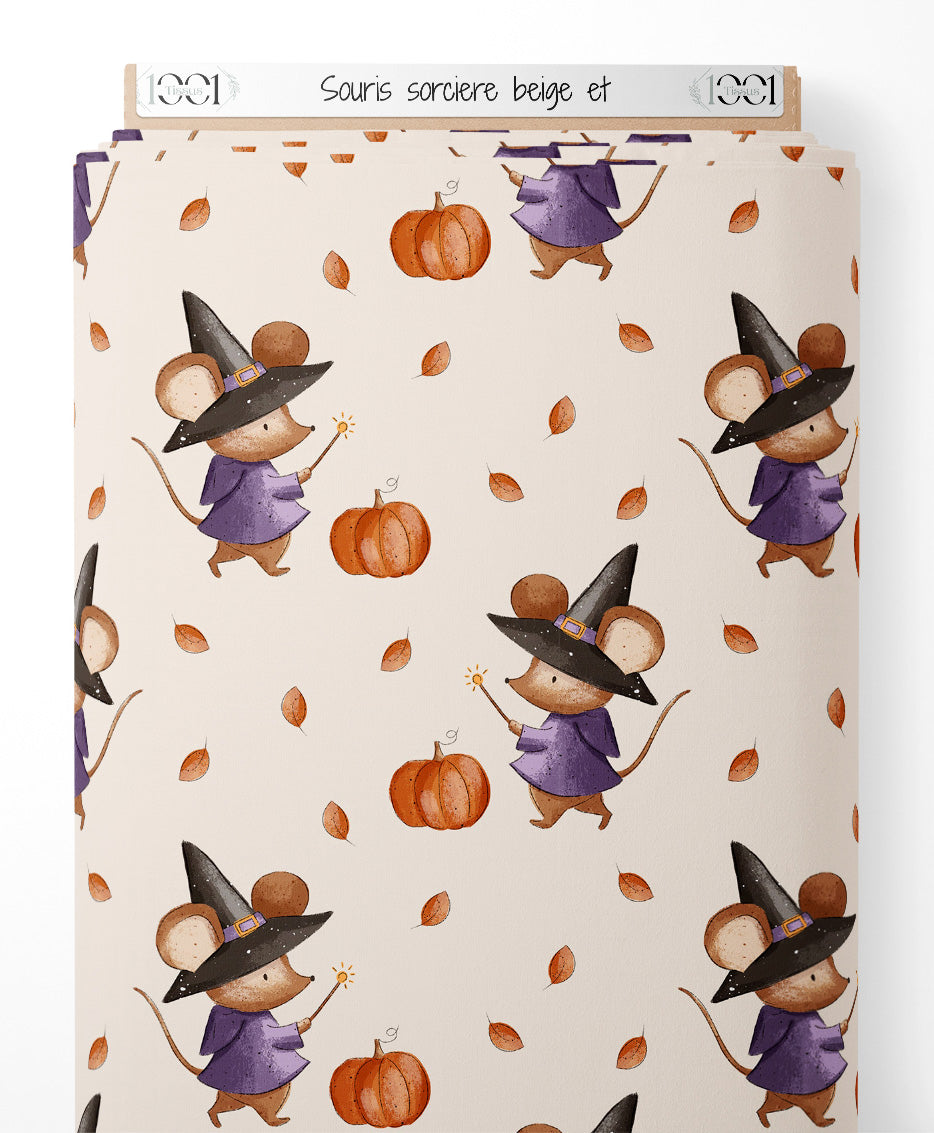 Les souris portent des chapeaux noirs pointus et des capes violettes. Les citrouilles sont rondes et orange, entourées de petites feuilles automnales.Les tissus