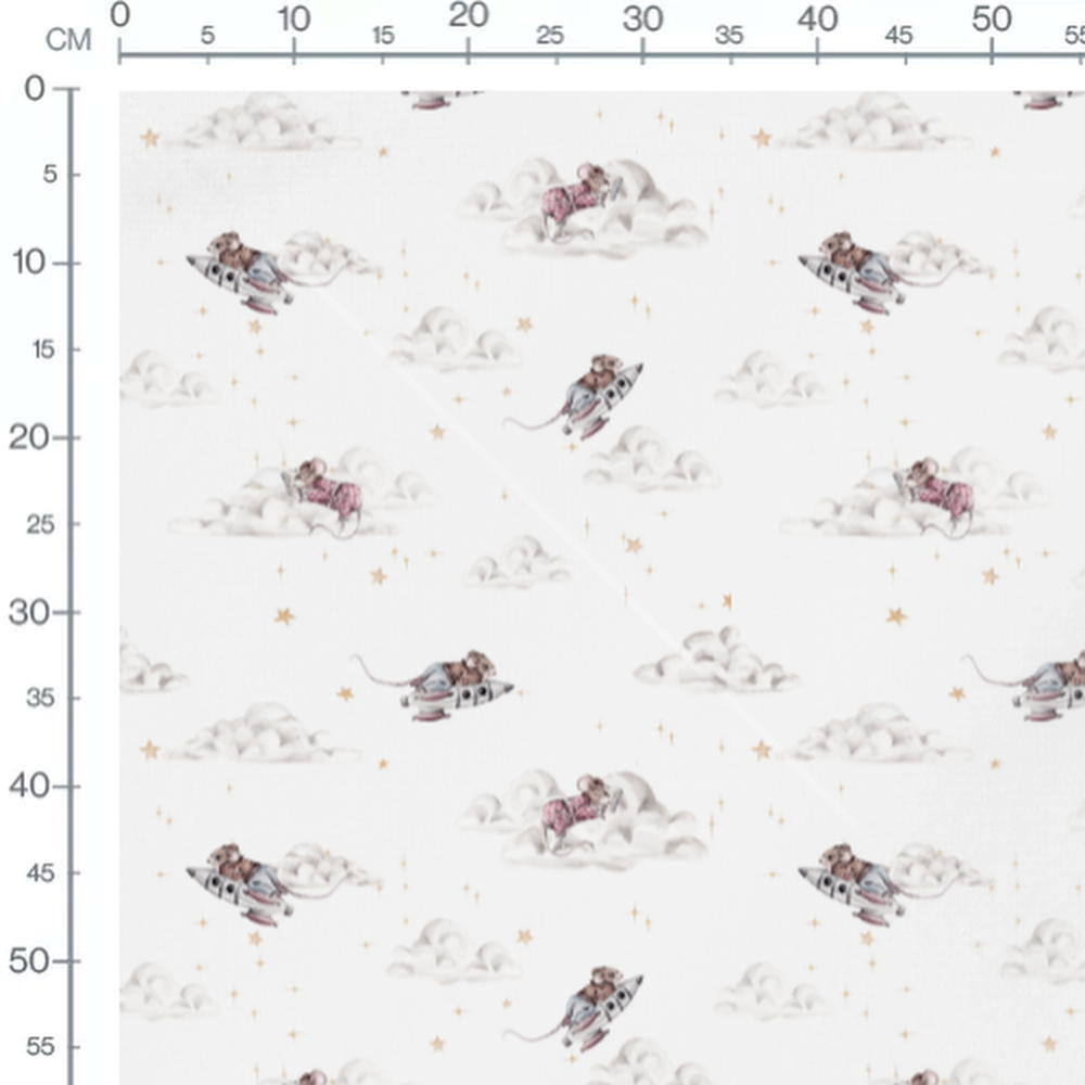 Les souris portent des combinaisons spatiales roses. Les fusées sont grises avec des détails noirs. Les nuages sont doux et blancs, créant une ambiance céleste.Les tissus
