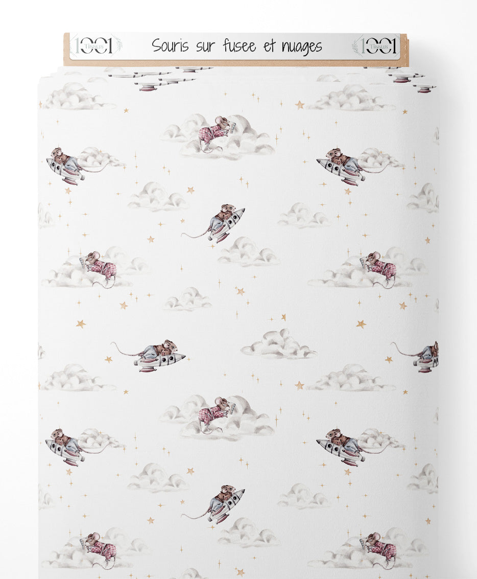 Tissu - Souris sur fusée et nuages