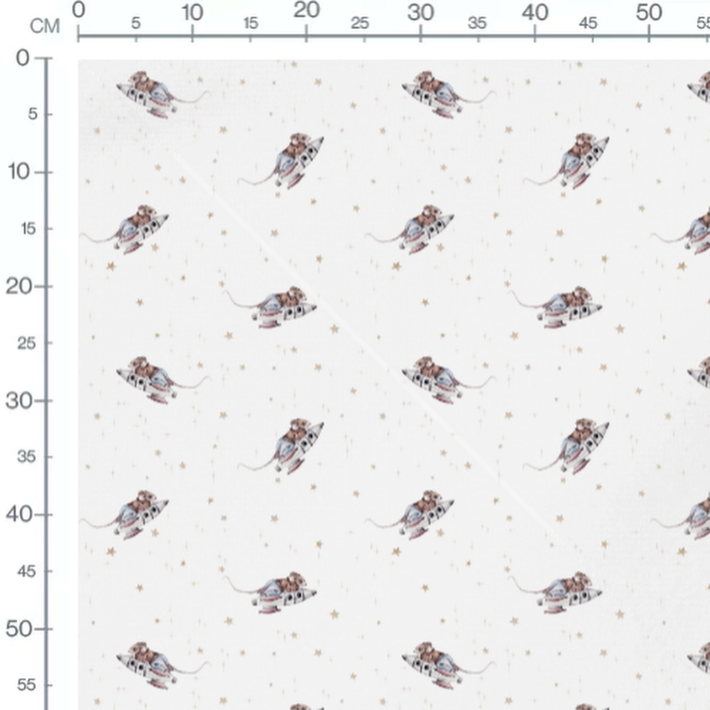 Les souris portent des combinaisons bleues et sont assises sur des fusées. Les fusées ont des détails rouges et noirs. Le fond est parsemé de petites étoiles dorées et de points lumineux.Les tissus