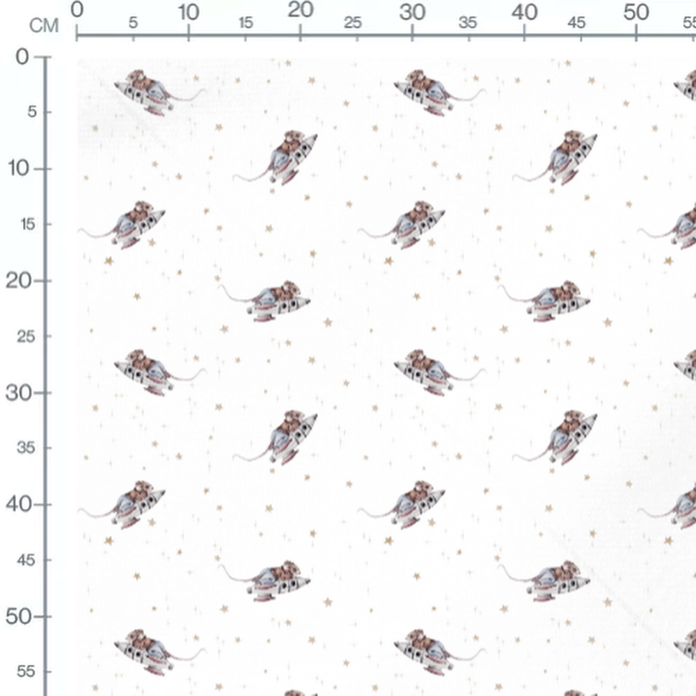 Les souris portent des vêtements bleus et sont assises sur des fusées. Les étoiles sont de différentes tailles et ajoutent une touche céleste au motif.Les tissus