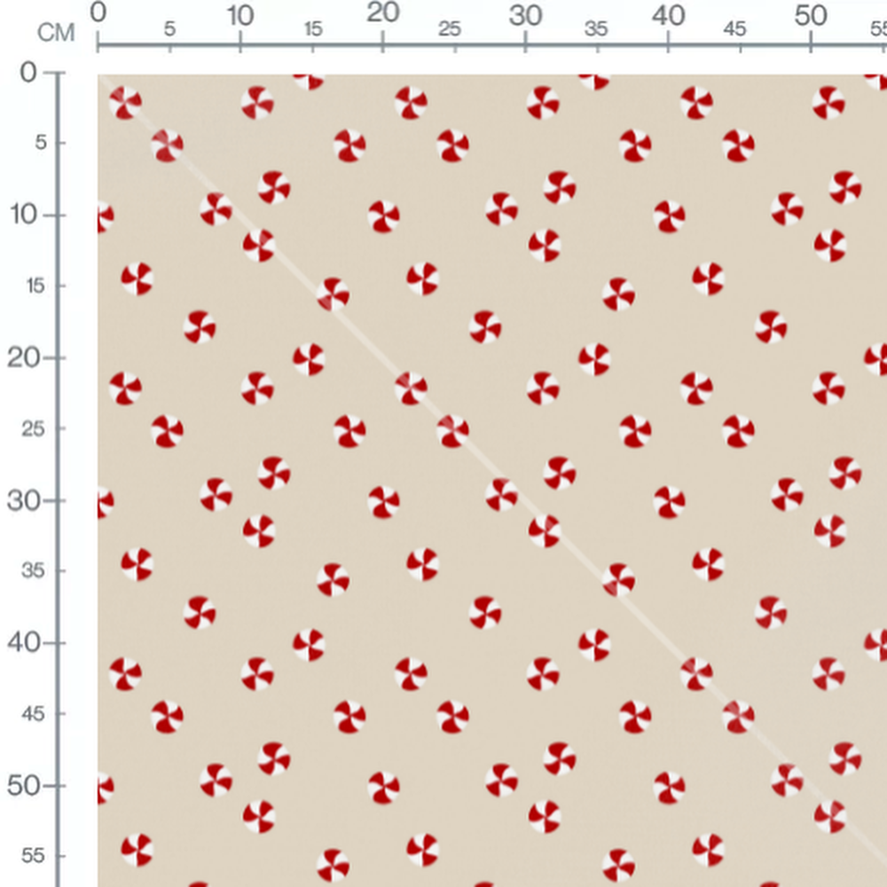 Les bonbons sont disposés uniformément sur le fond beige. Chaque bonbon présente une spirale alternant rouge et blanc, évoquant des friandises de Noël.Les tissus
