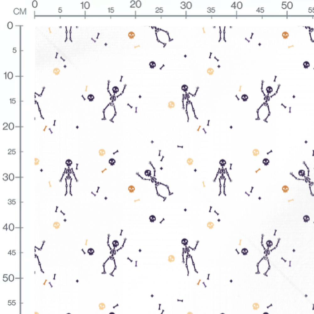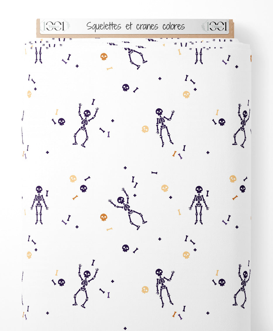 Les squelettes sont représentés dans différentes positions. Les crânes sont de couleur orange clair. Des os et des croix noirs ajoutent des détails au motif.Les tissus