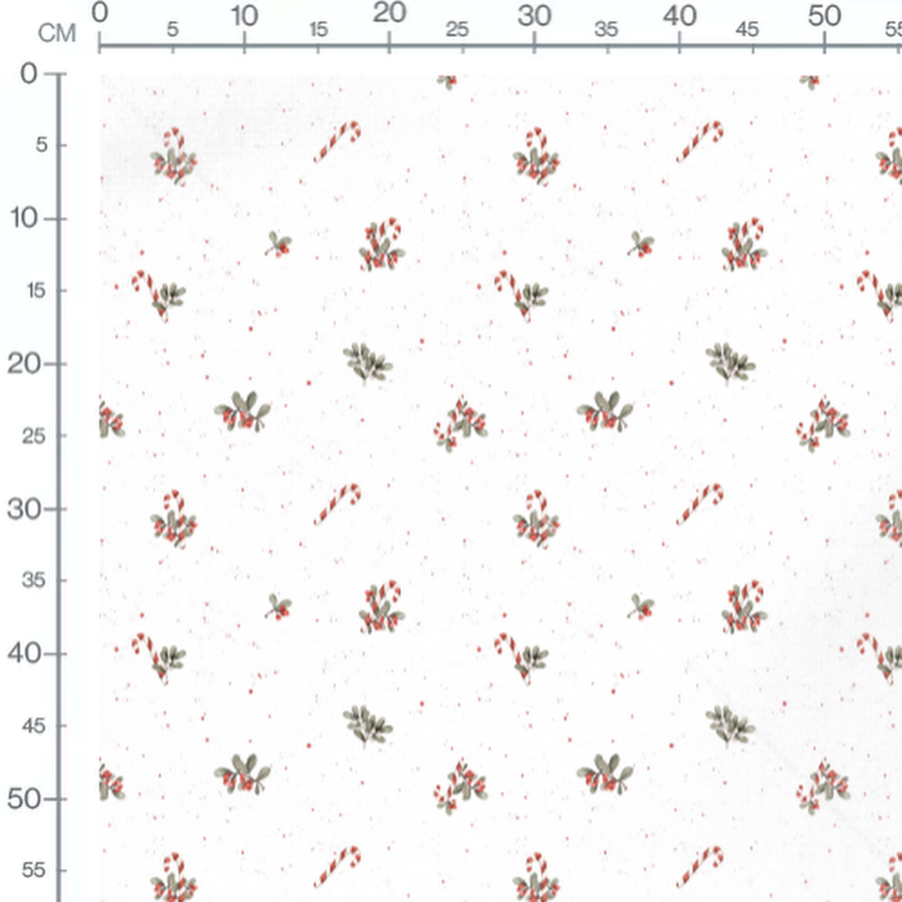 Les sucres d'orge sont entrelacés avec des feuilles vertes et des baies rouges. Le fond blanc est parsemé de petites taches rouges. Les motifs évoquent une ambiance festive et hivernale.Les tissus