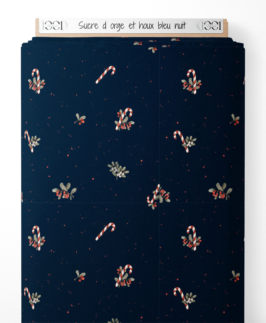 Les sucres d'orge sont entourés de petites branches de houx. Les baies rouges contrastent avec le fond bleu nuit. Les feuilles vertes ajoutent une touche naturelle au motif.Les tissus