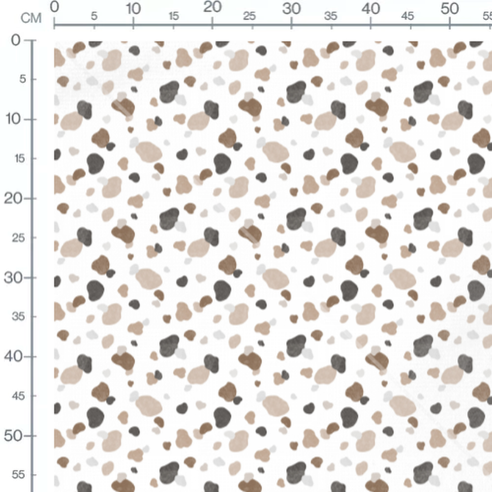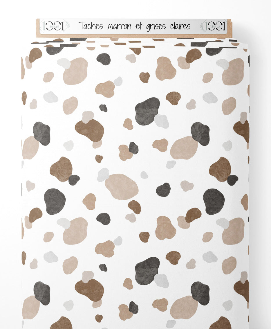 Les taches varient en taille et en forme, créant un motif dynamique. Les nuances de marron et de gris se mélangent harmonieusement. Le fond blanc met en valeur les couleurs des taches. Les formes abstraites ajoutent une touche moderne au design.Les tissus