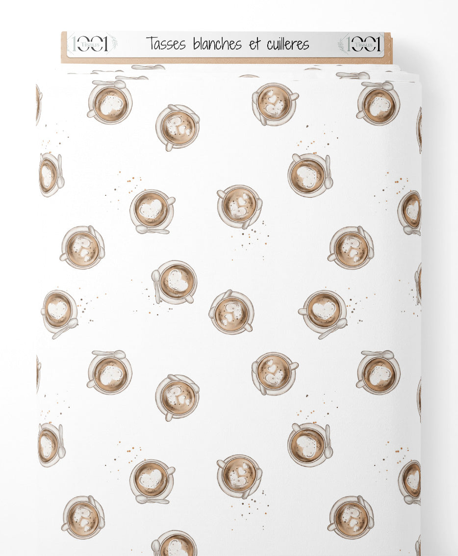 Des éclaboussures de café entourent les tasses. Les cuillères sont posées à côté des tasses. Les nuances de brun du café contrastent avec le fond blanc.Les tissus