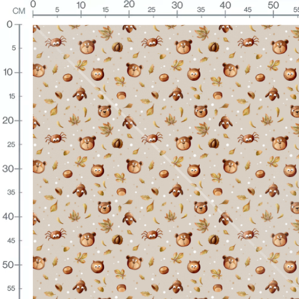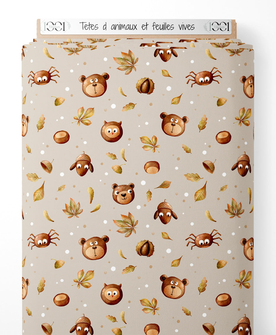 Les têtes d'ours et de hiboux sont entourées de feuilles aux teintes automnales. Des araignées et des glands ajoutent une touche ludique au motif. Les châtaignes complètent l'ambiance forestière.Les tissus