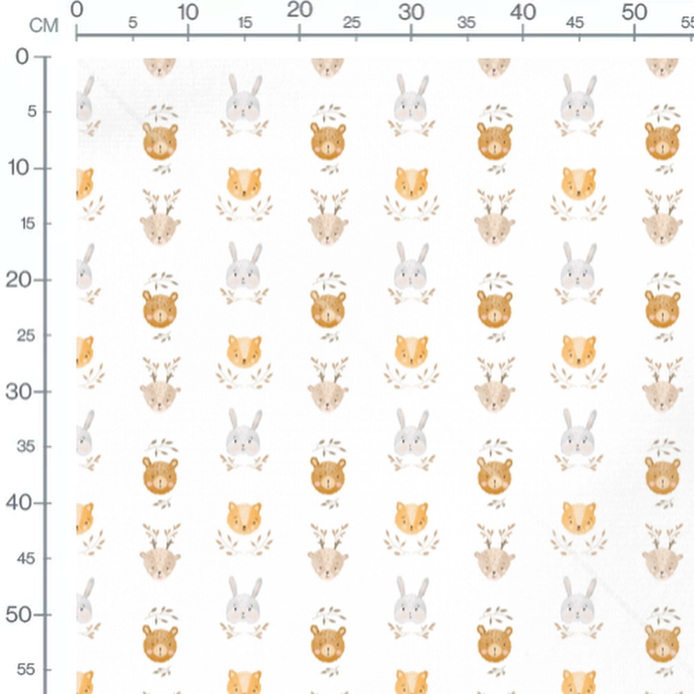 Les têtes d'animaux sont entourées de petites branches. Les couleurs douces incluent le gris, le beige et l'orange pastel. Chaque animal est dessiné avec un style simple et charmant.Les tissus