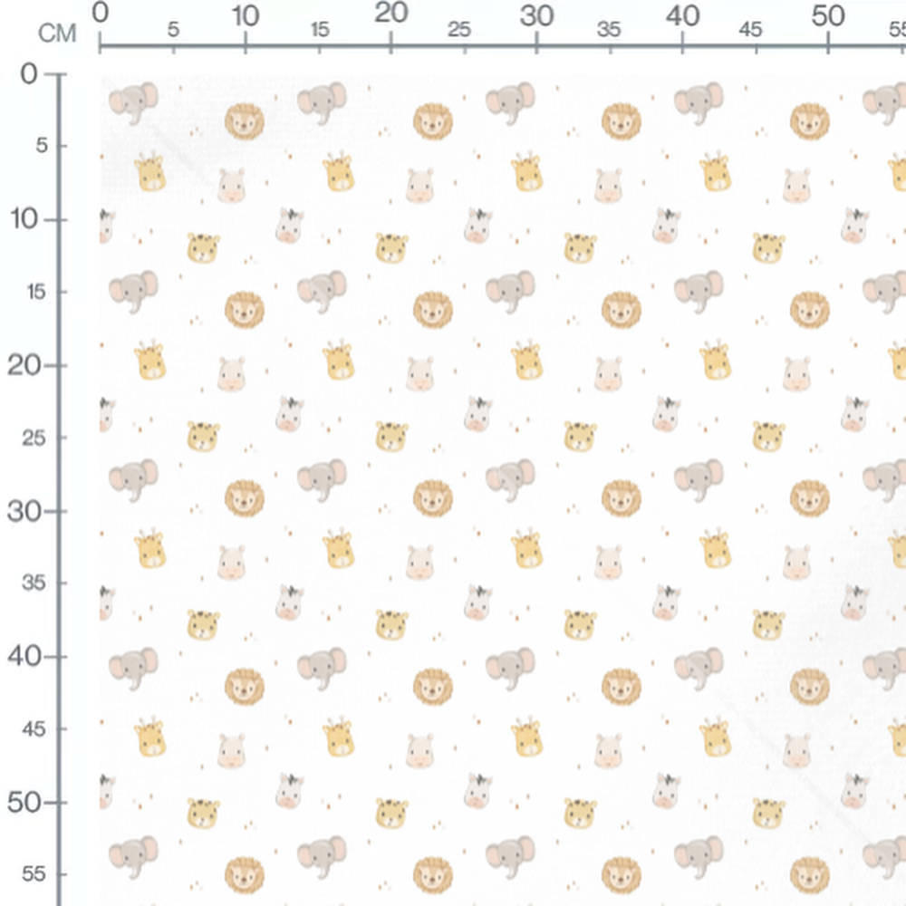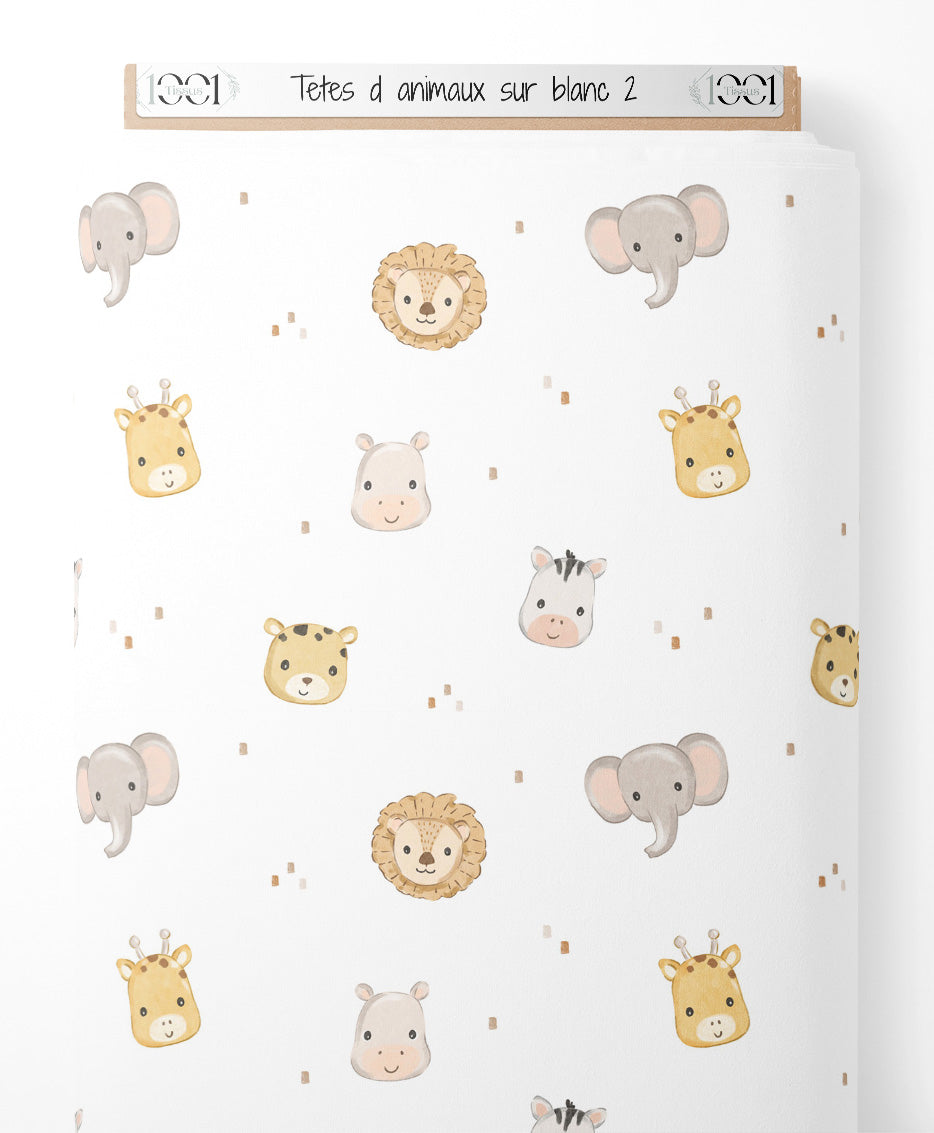 Les animaux sont dessinés avec des expressions amicales. Les couleurs douces incluent des nuances de gris, beige et jaune. De petits carrés marron clair sont dispersés sur le fond.Les tissus