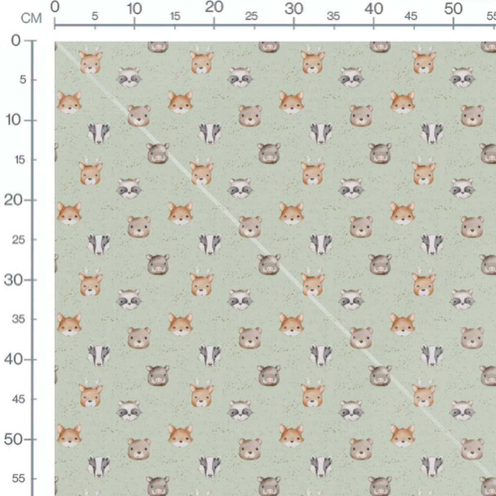 Les animaux sont illustrés avec des expressions amicales. Le fond vert clair est parsemé de petites taches brunes et grises. Chaque animal est dessiné avec des détails doux et des couleurs naturelles.Les tissus