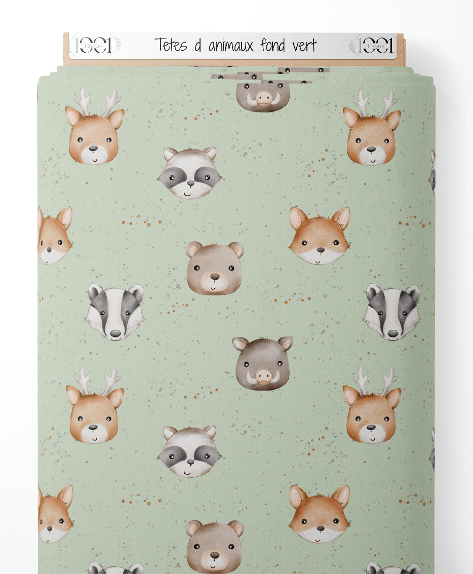 Tissu - Têtes d'animaux sur fond vert