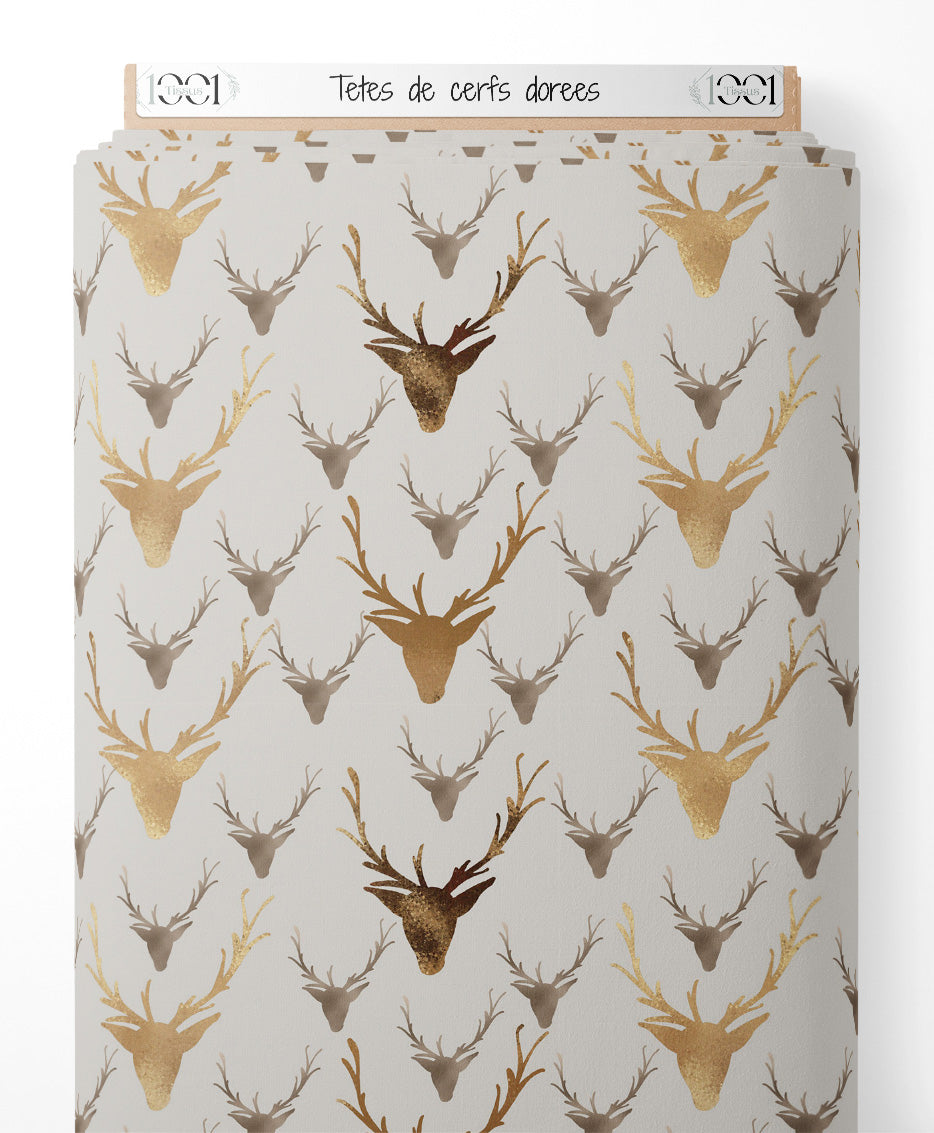 Les cerfs sont représentés avec des nuances de doré et de brun. Le fond beige met en valeur les motifs de cerfs. Les bois des cerfs sont longs et élégants.Les tissus