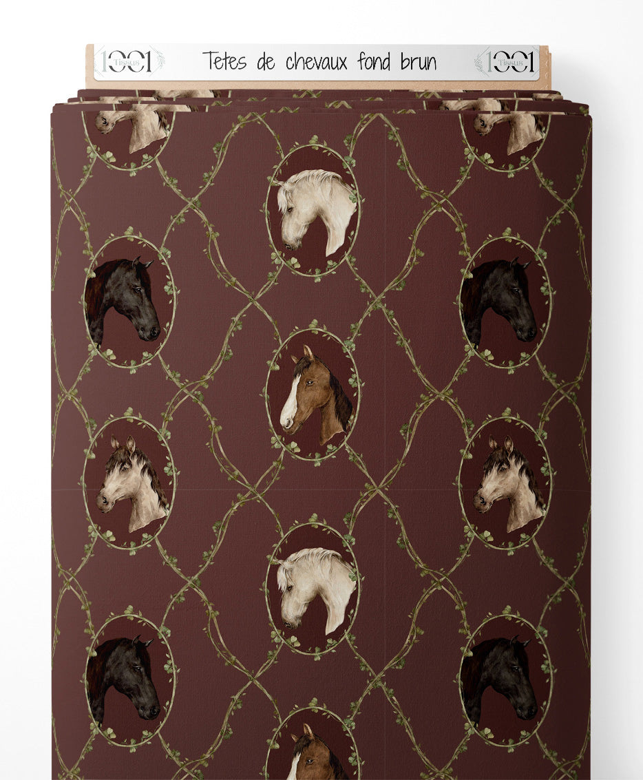 Tissu - Têtes de chevaux sur fond brun