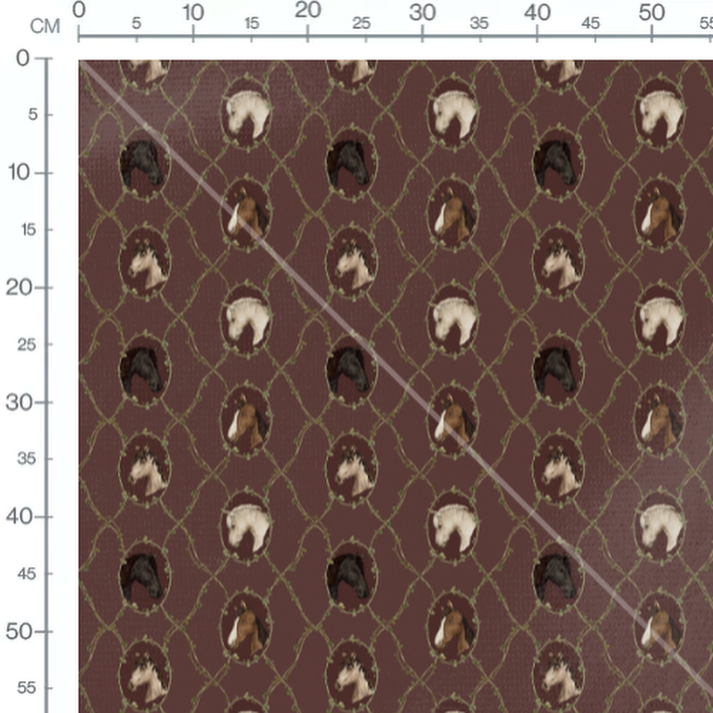 Les chevaux sont représentés dans des tons naturels avec des détails réalistes. Les lianes vertes ajoutent une touche de nature au motif. Chaque tête de cheval est encadrée par un ovale délicat.Les tissus
