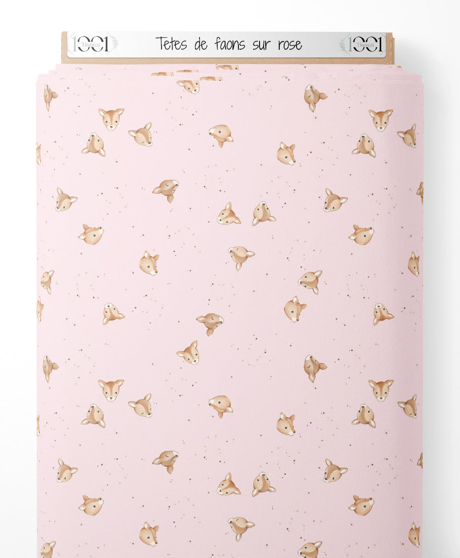 Tissu - Têtes de faons sur rose