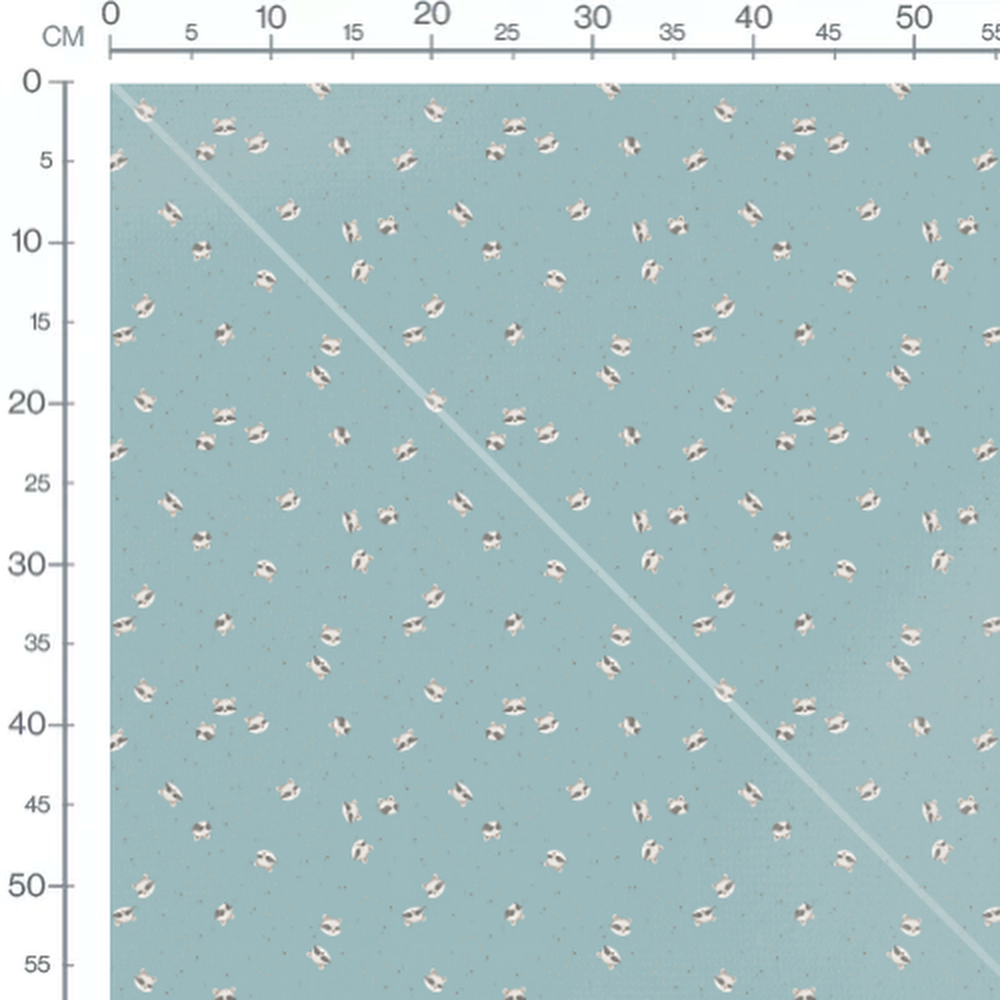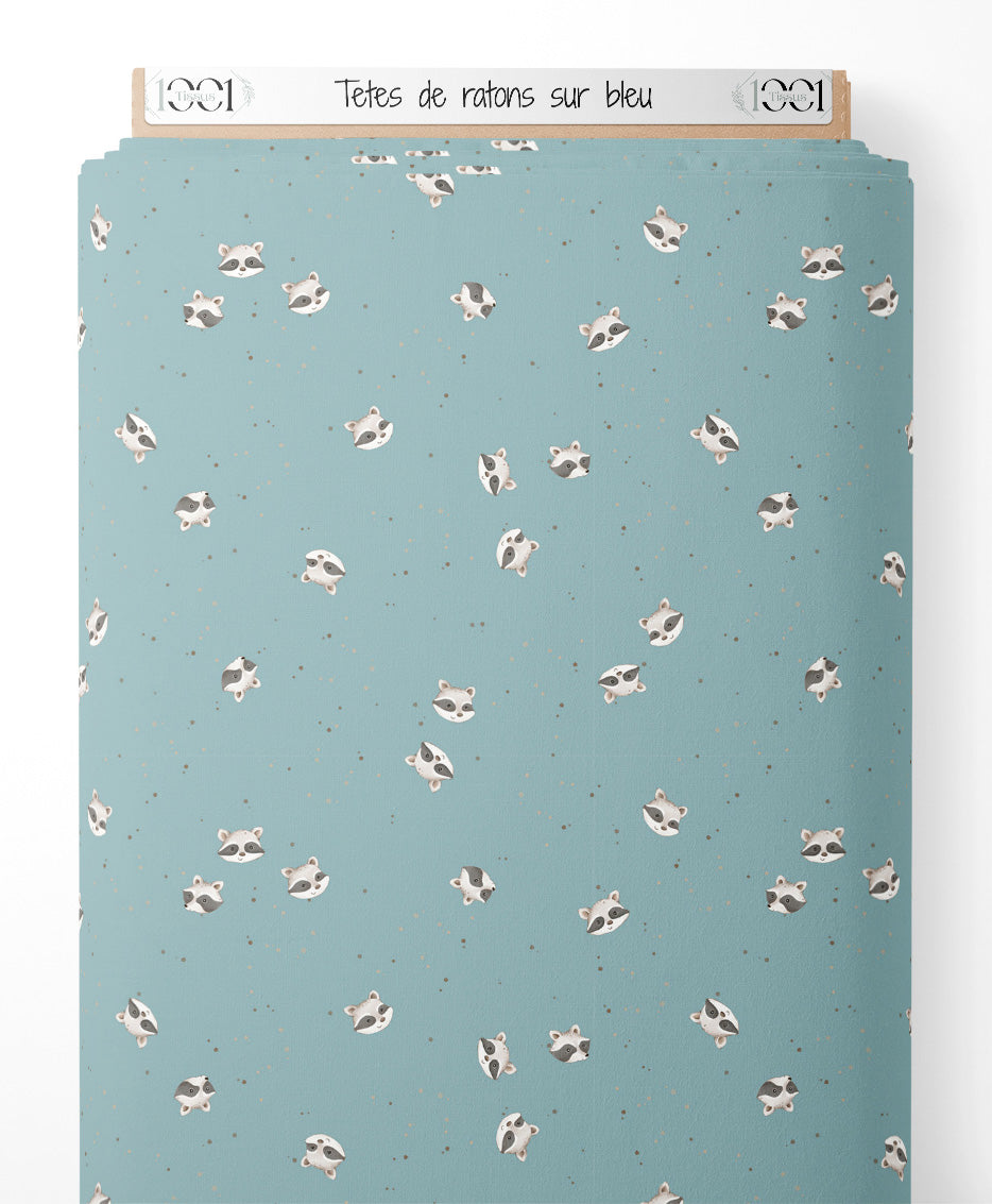 Têtes de ratons laveurs grises et blanches sur fond bleu. Petits points gris dispersés.Les tissus
