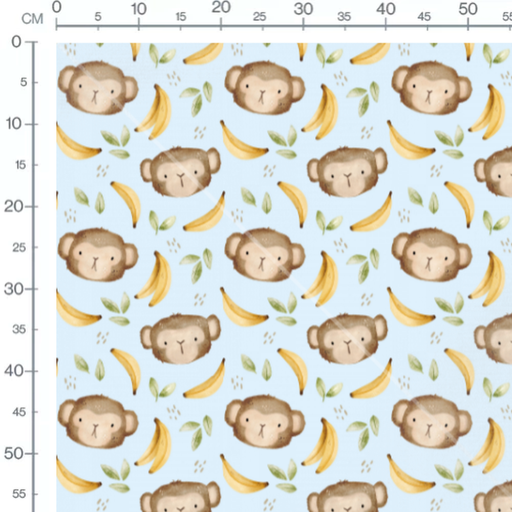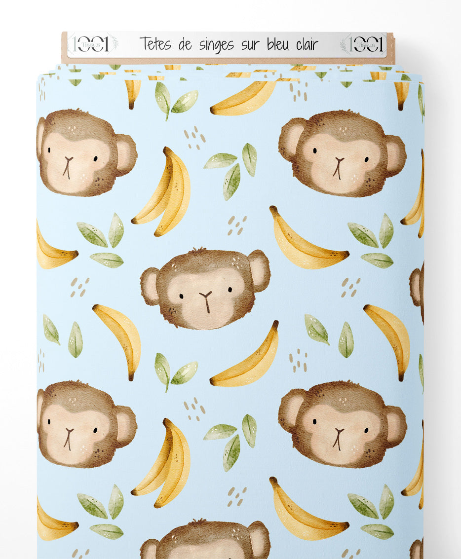 Les têtes de singes sont dessinées dans des tons marron doux. Les bananes sont d'un jaune vif, ajoutant une touche de couleur. Les petites feuilles vertes complètent le motif de manière harmonieuse.Les tissus