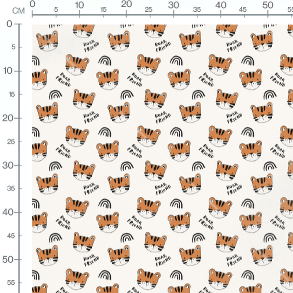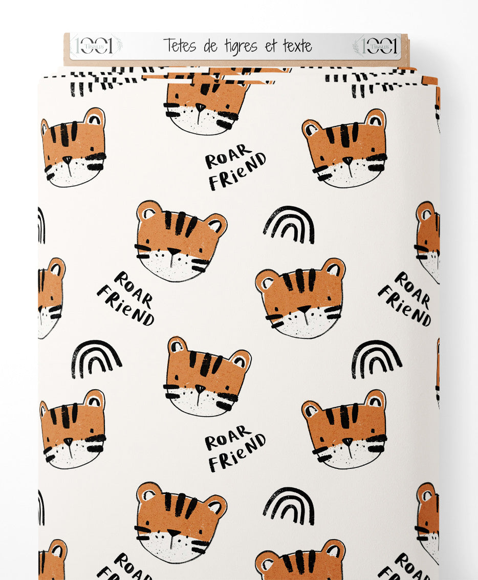 Les têtes de tigres sont dessinées avec des traits simples et des couleurs marron et noir. Le texte 'ROAR FRIEND' est écrit en noir à côté des motifs. Des arcs noirs complètent le design sur le fond blanc.Les tissus