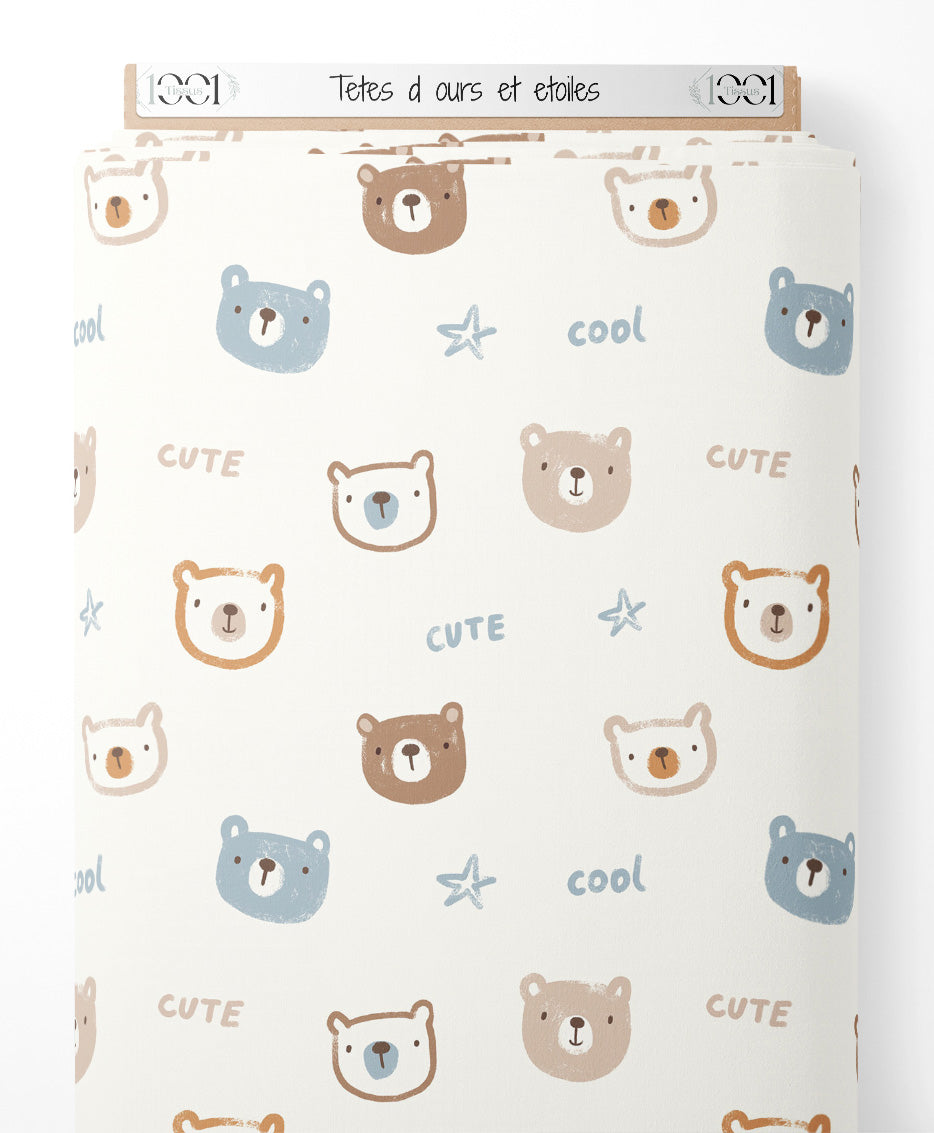 Les têtes d'ours sont dessinées dans des tons doux et variés. Les étoiles ajoutent une touche ludique au motif. Les mots 'cool' et 'cute' sont dispersés entre les motifs d'ours.Les tissus