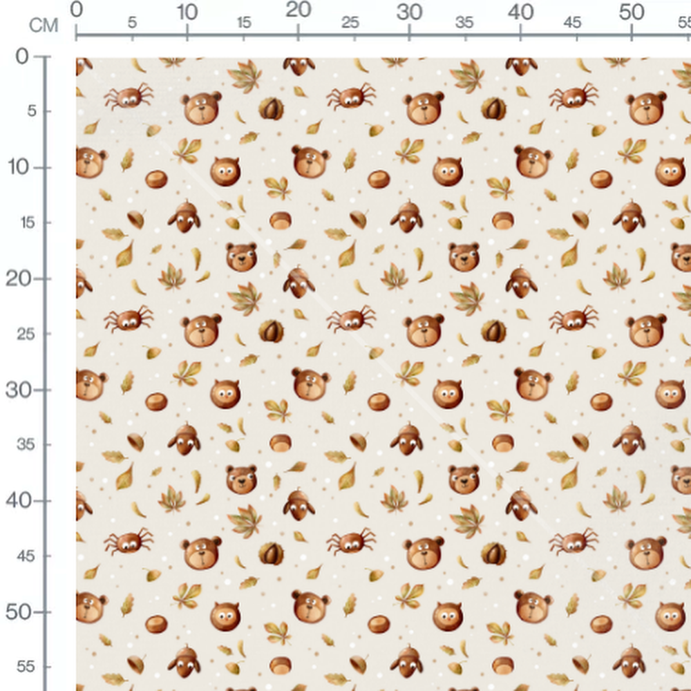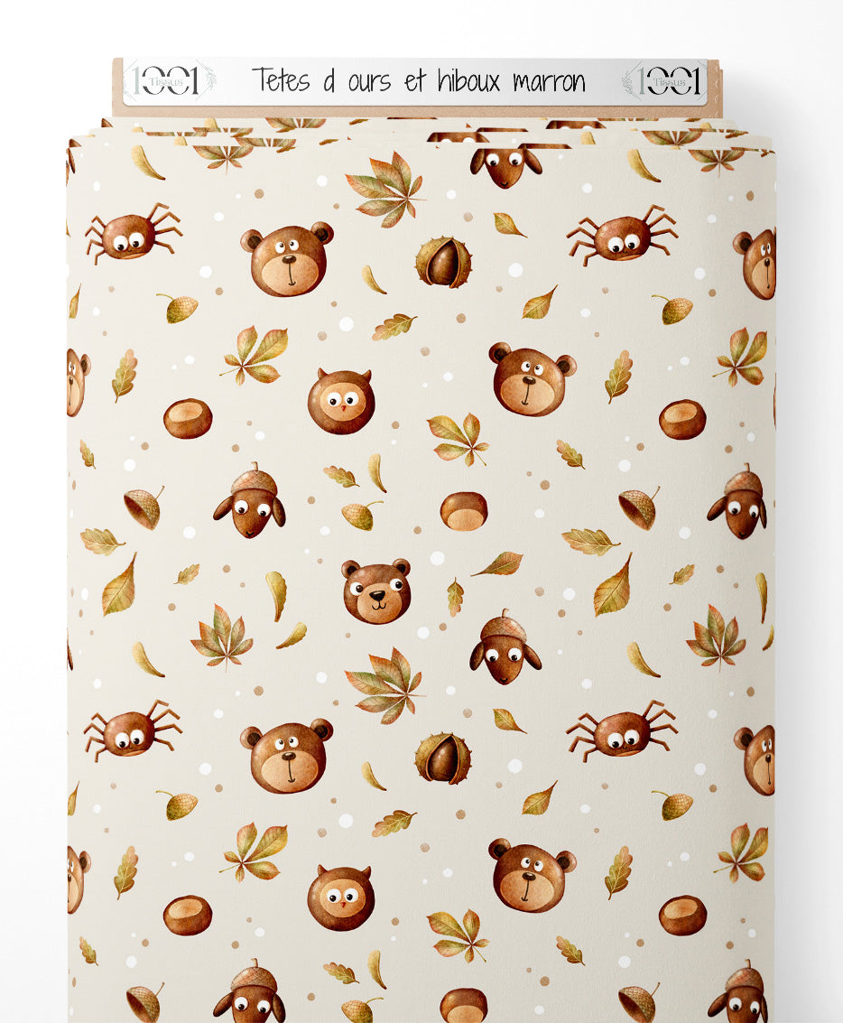 Les têtes d'ours sont marron clair avec des expressions amicales. Les hiboux ont de grands yeux ronds et sont entourés de glands et de feuilles d'automne. Les araignées sont petites et marron, ajoutant une touche ludique au motif.Les tissus
