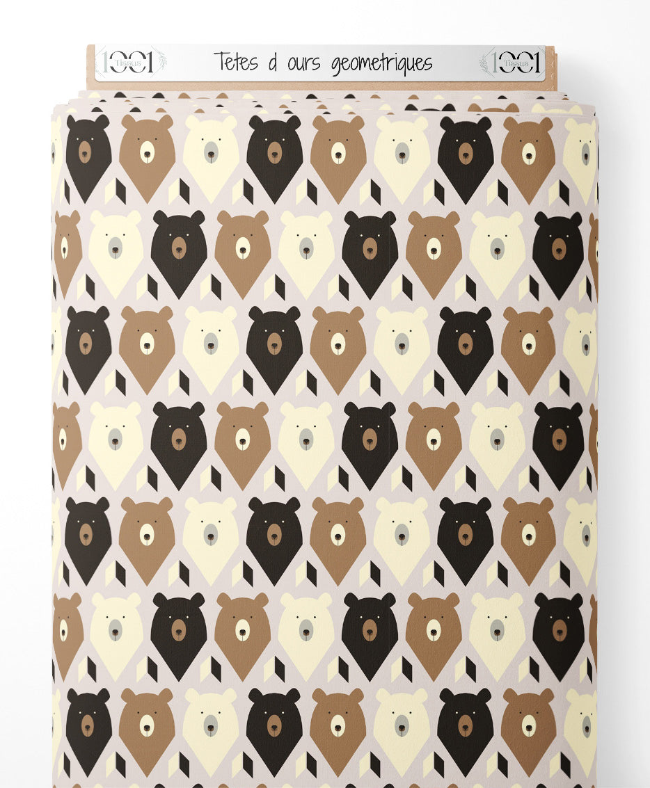Les têtes d'ours sont stylisées avec des formes triangulaires. Les couleurs varient entre marron, beige et noir. Les formes géométriques ajoutent un contraste subtil au motif.Les tissus