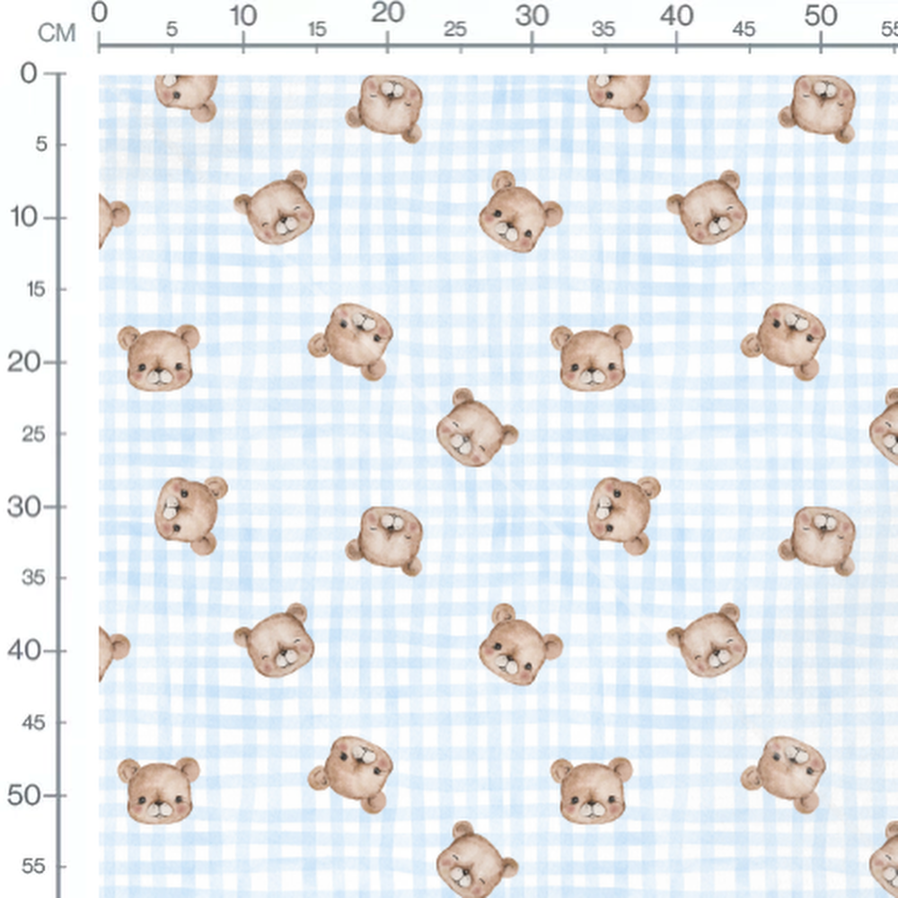 Les carreaux bleu clair ajoutent une touche douce et apaisante au motif. Les têtes d'ours sont dessinées dans un style aquarelle, ce qui leur donne un aspect chaleureux.Les tissus