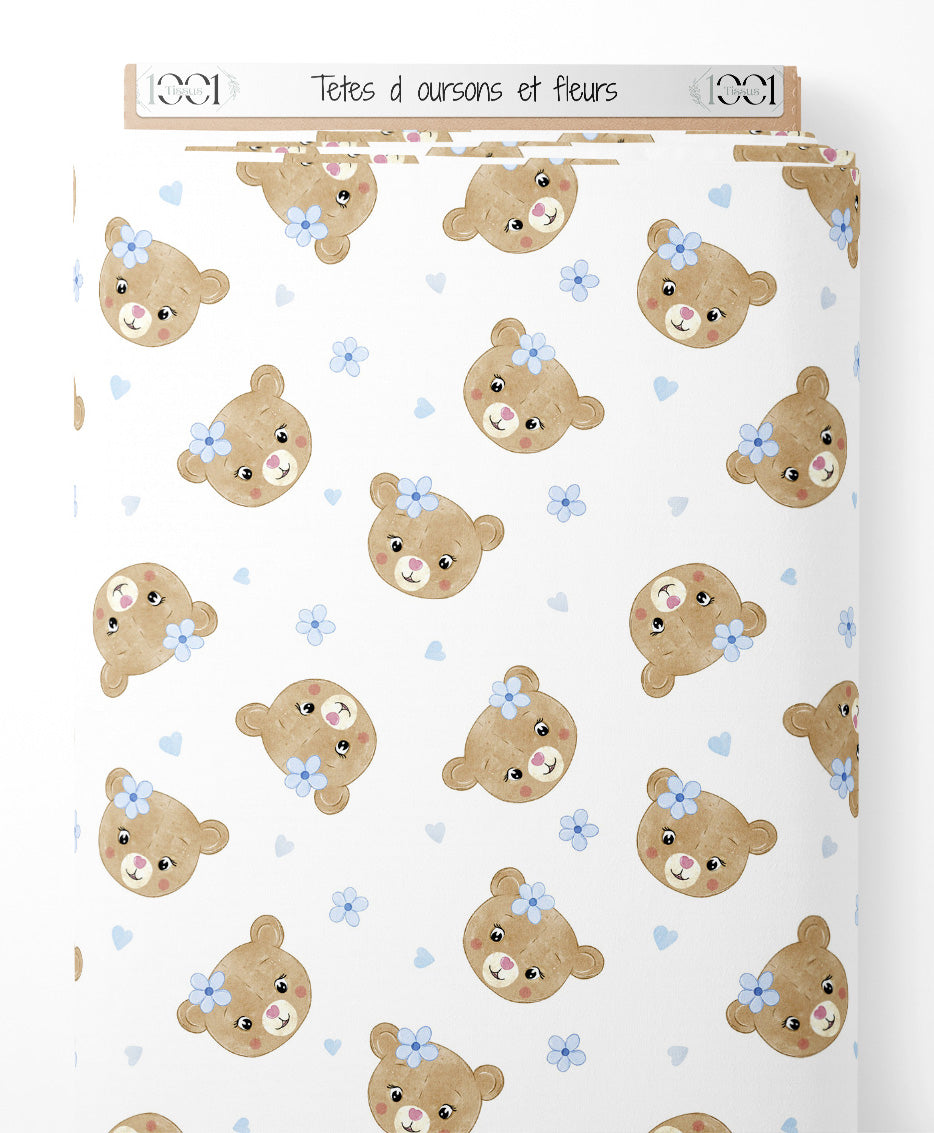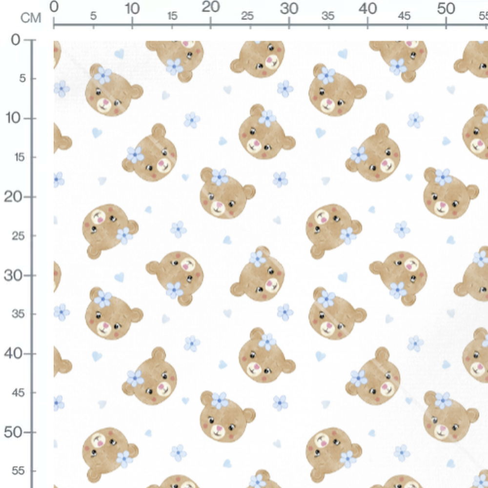 Les oursons ont des joues roses et des yeux expressifs. Les fleurs bleues sont placées près des oreilles des oursons. De petits cœurs et fleurs bleus ajoutent une touche ludique au motif.Les tissus
