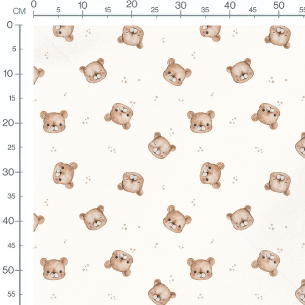 Les oursons ont des expressions joyeuses et sont dessinés dans des tons doux. Les petits points ajoutent une touche ludique au motif.Les tissus