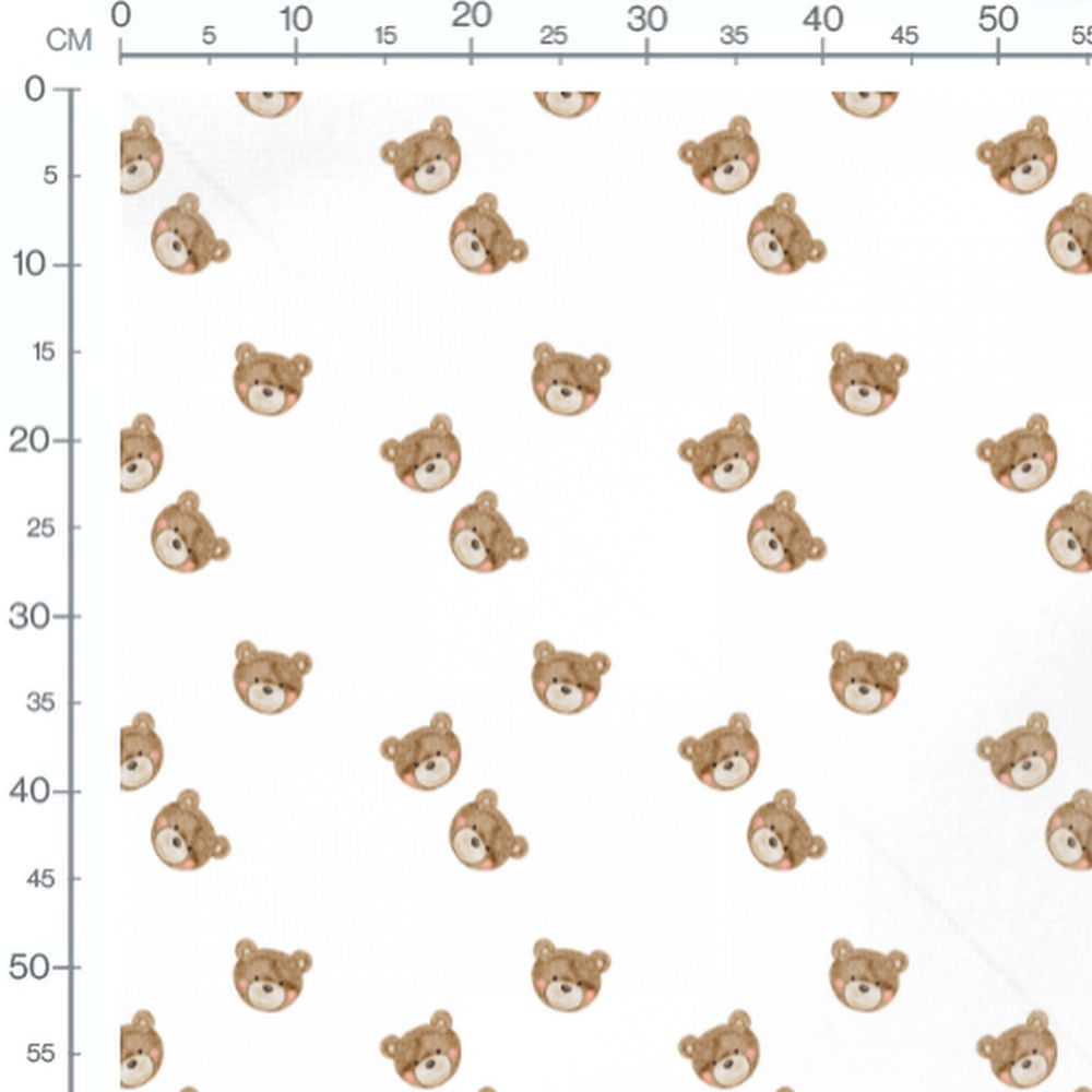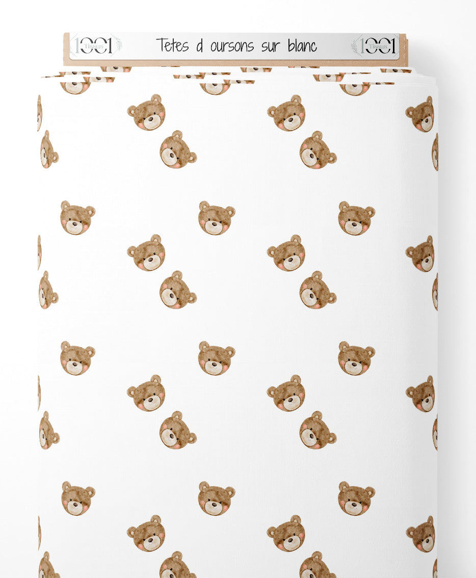 Les oursons présentent un visage souriant avec des yeux noirs et un museau blanc. Le fond blanc met en valeur les détails des oursons.Les tissus