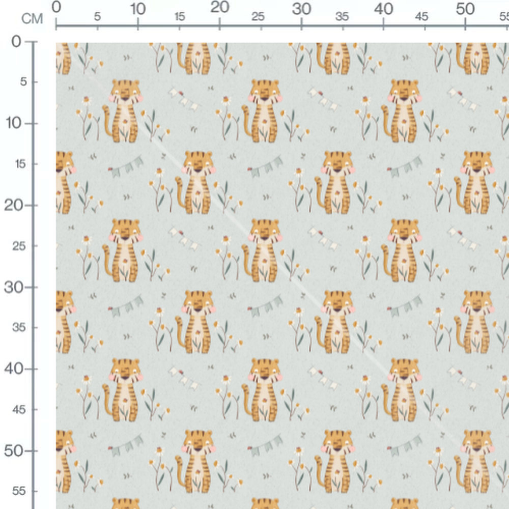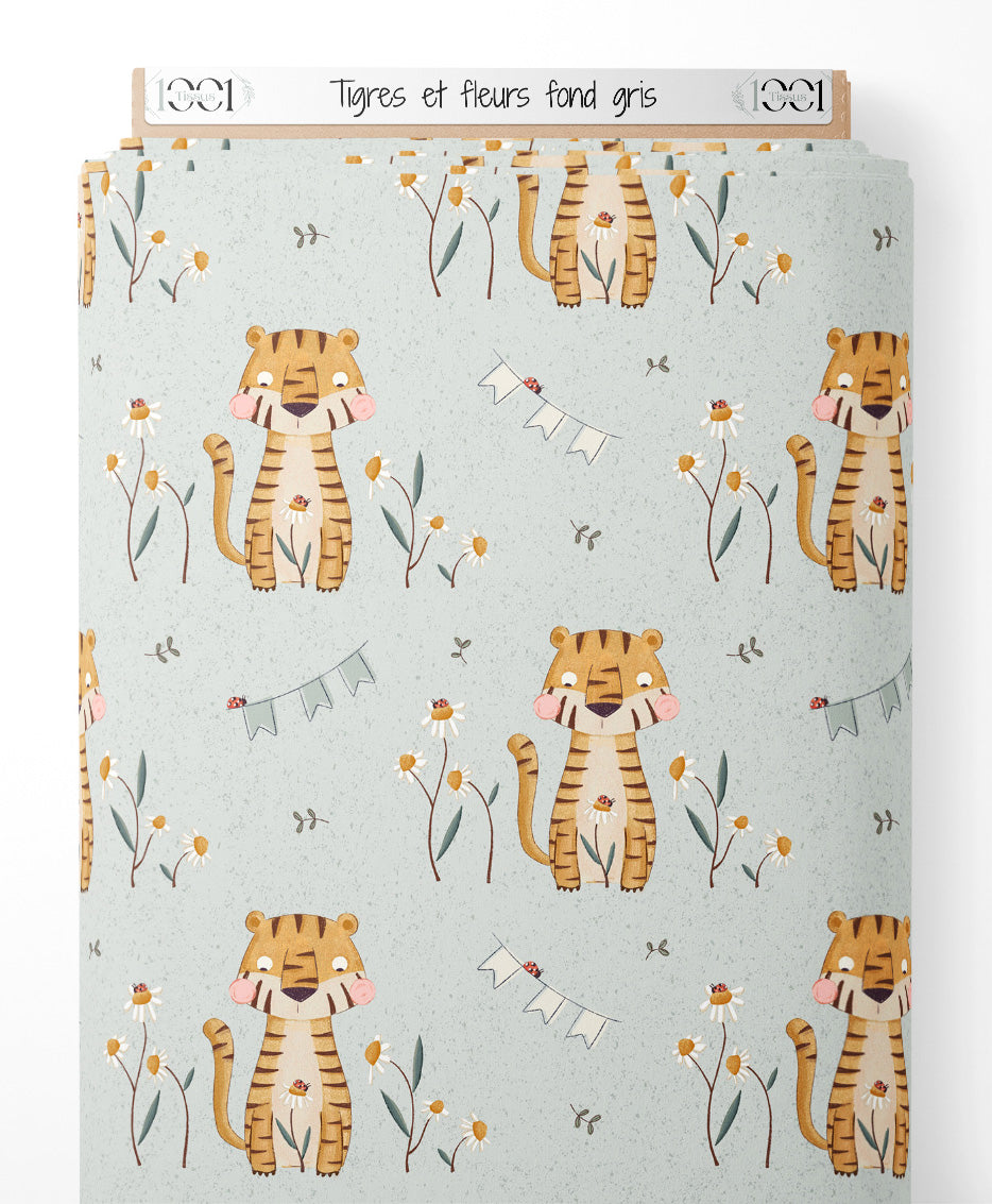 Les tigres ont des rayures brunes et des joues roses. Les fleurs blanches sont entourées de feuilles vertes. De petites coccinelles rouges sont posées sur les fleurs. Des guirlandes blanches flottent entre les motifs.Les tissus