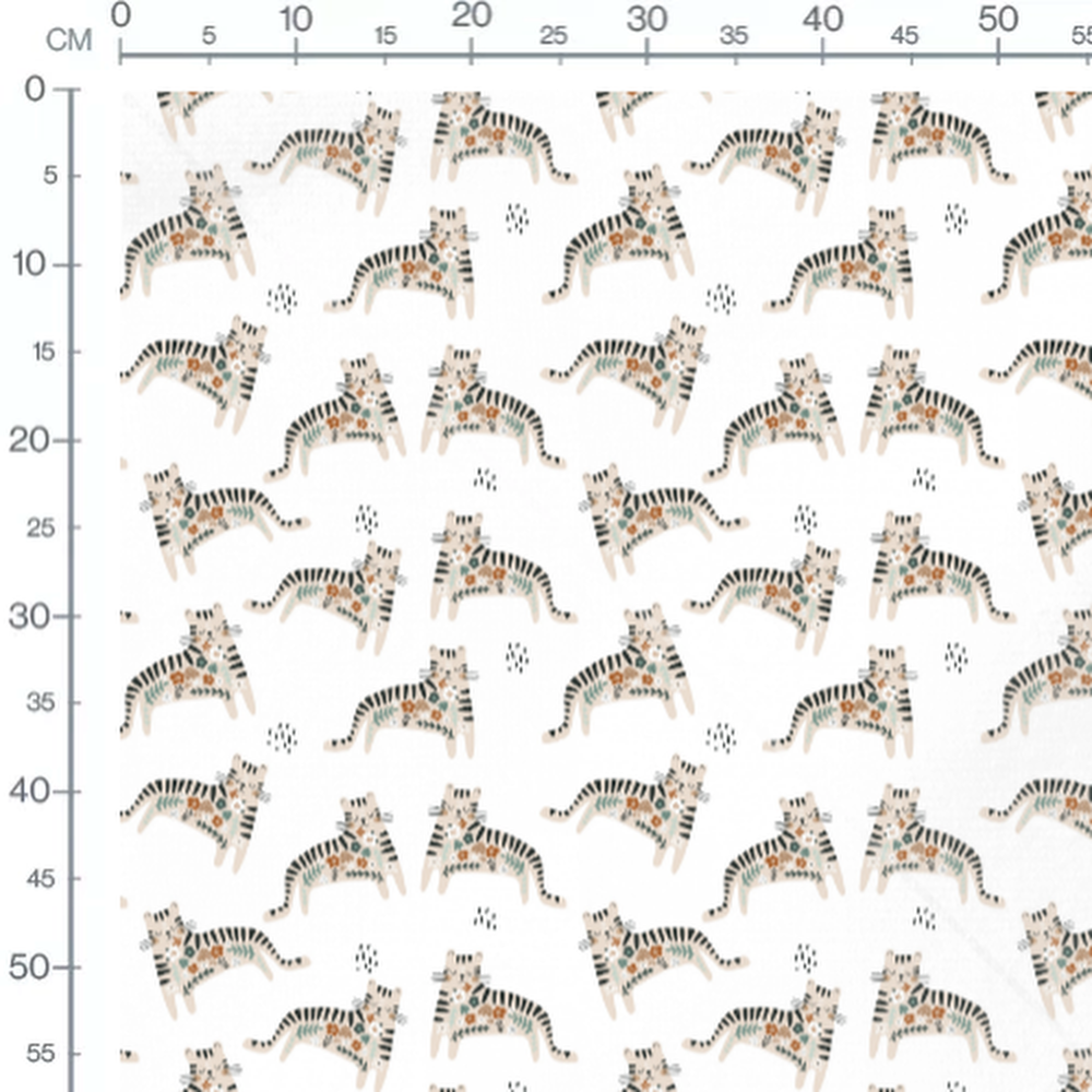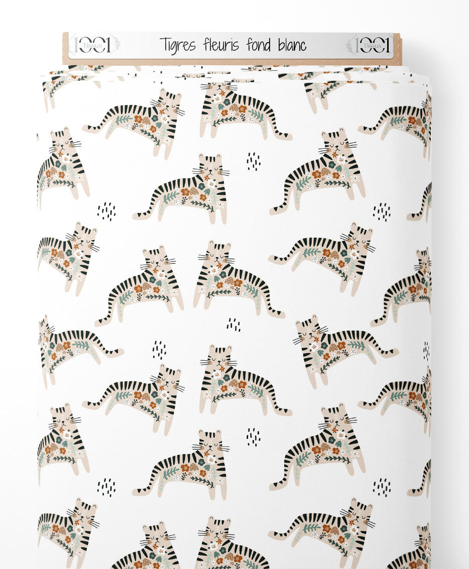Les tigres présentent des rayures noires distinctives. Des motifs floraux en orange, vert et marron ornent leur corps. Le fond blanc met en valeur les détails des motifs.Les tissus