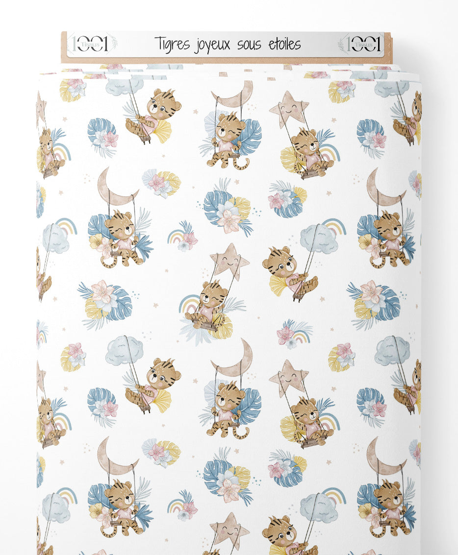 Les tigres sont accompagnés de nuages et de fleurs pastel. Les motifs incluent des éléments célestes comme des étoiles souriantes et des croissants de lune. Les couleurs sont douces avec des tons de bleu, jaune et rose.Les tissus