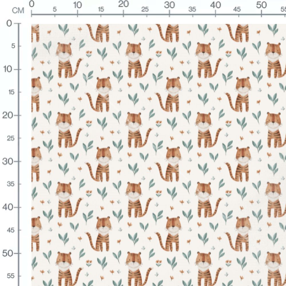 Les tigres sont dessinés avec des expressions amicales. Les feuilles vertes sont dispersées harmonieusement. De petites fleurs orange ajoutent une touche de couleur vive.Les tissus