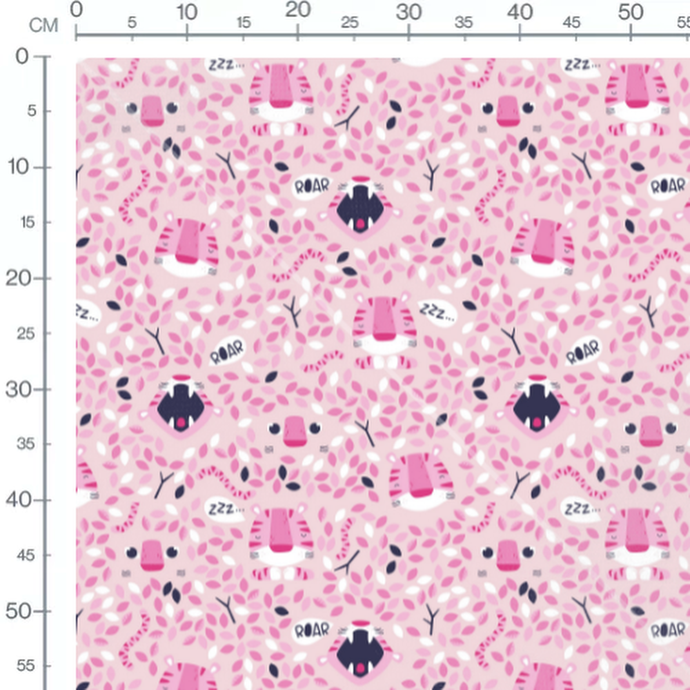 Les tigres affichent des expressions variées avec des motifs de zébrures. Le fond est parsemé de feuilles et de branches stylisées. Des mots comme 'ROAR' et 'ZZZ' ajoutent une touche ludique.Les tissus